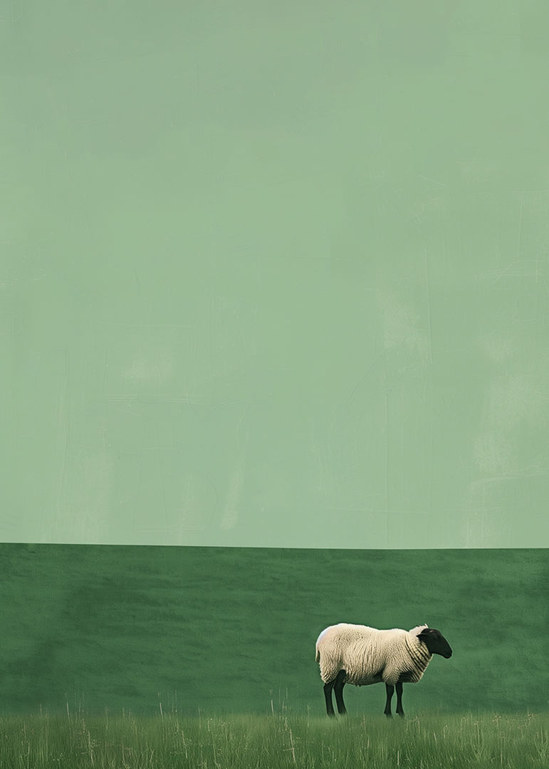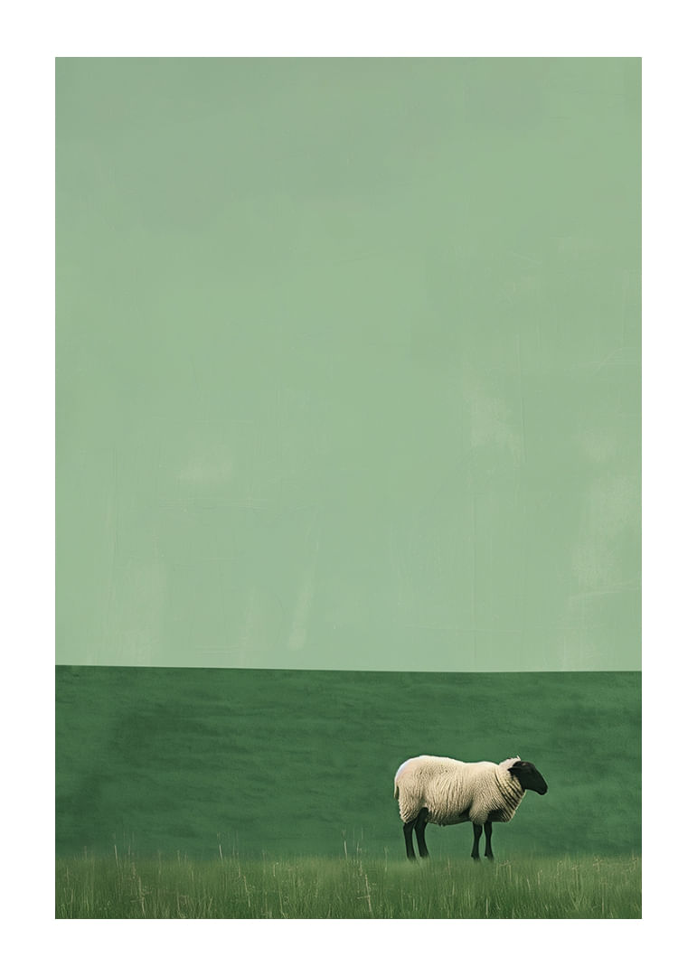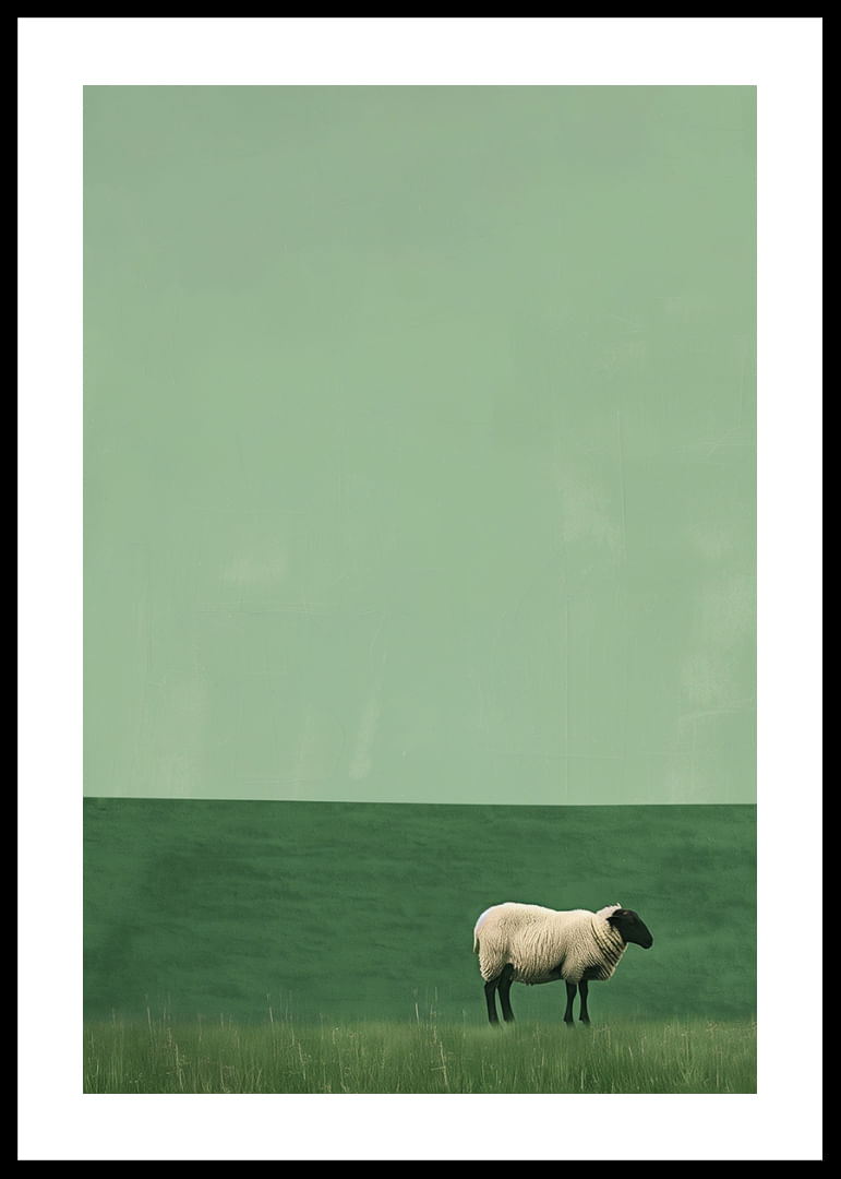 Amidst a sea of soft, green hues, a lone sheep stands on this poster, evoking a sense of stillness and peace. The minimalist design and subtle shifts in the shades of the grass deepen the mystery and draw the eye inward. This poster fits perfectly in the living room, where it creates a calming and meditative atmosphere for all who look at it.