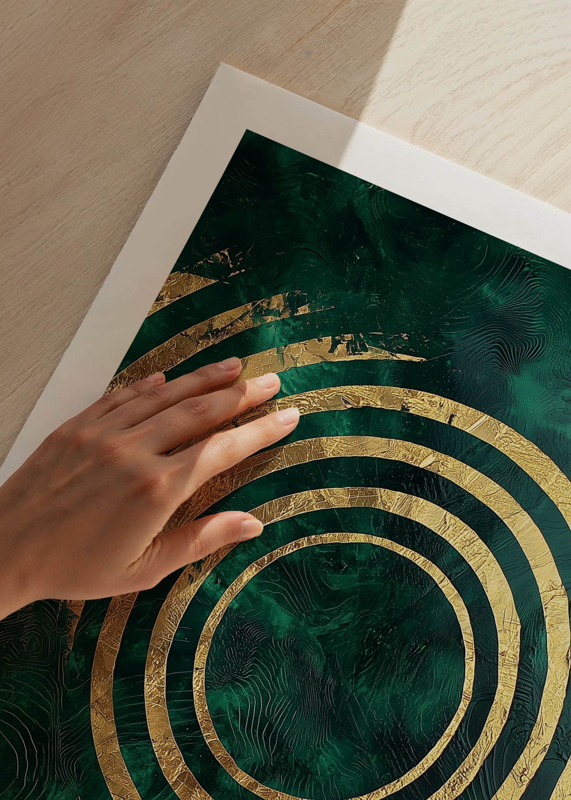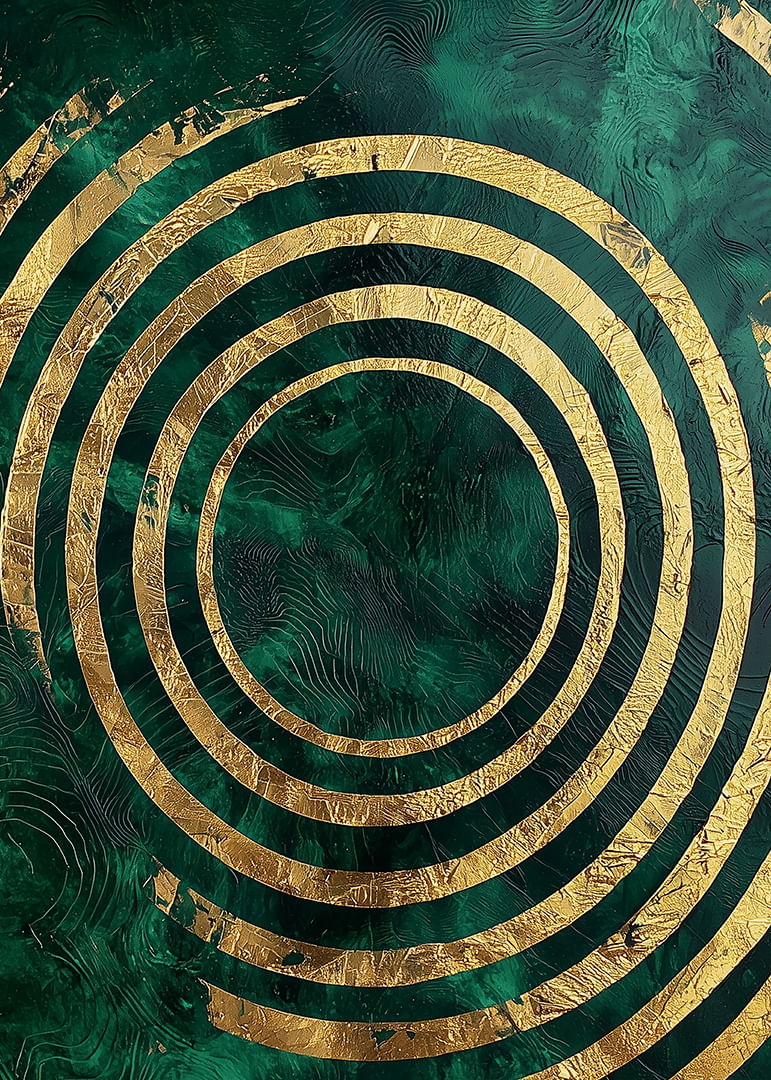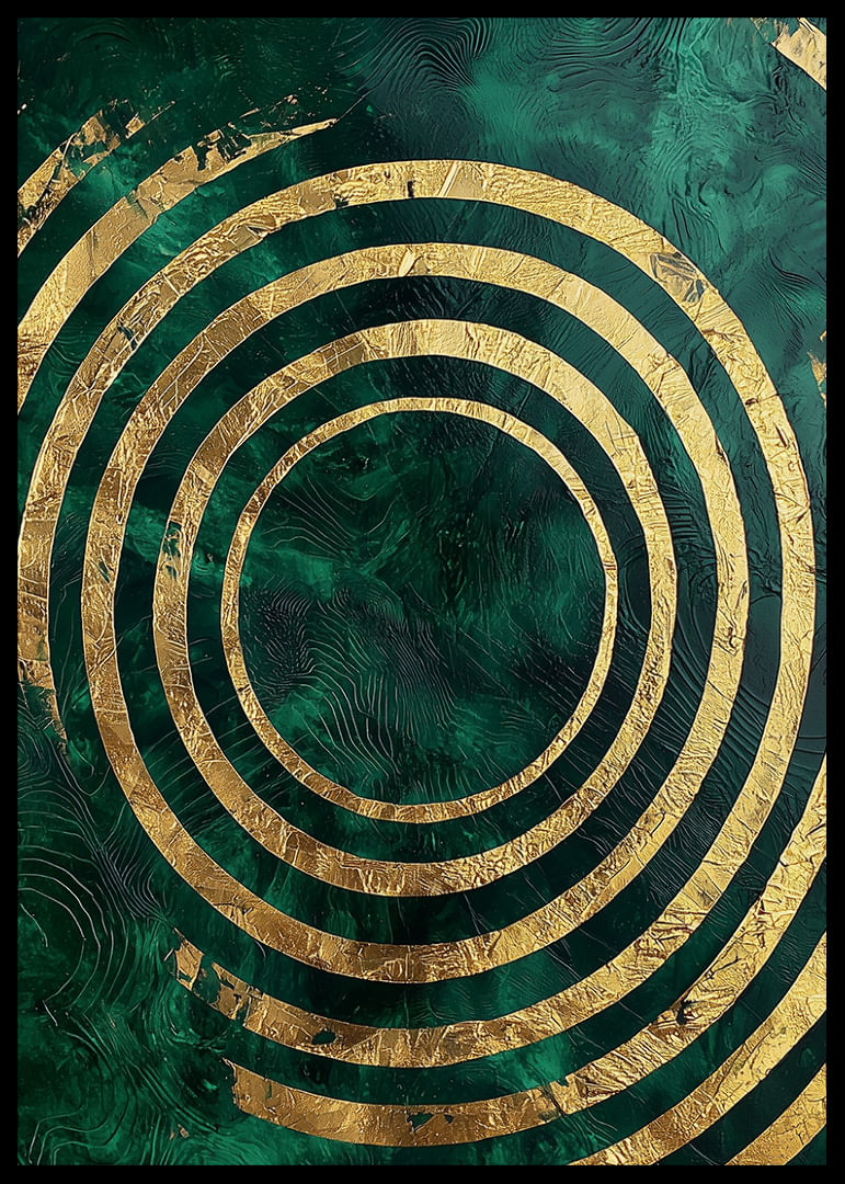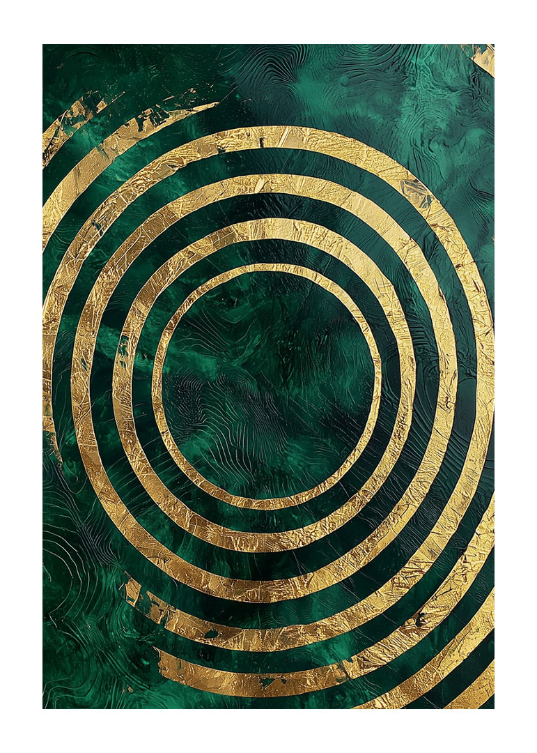 This poster immediately catches the eye with golden circles dancing across a deep green background. The harmonious movement and rich color palette create a sense of calm and sophistication. Each golden ring seems to whisper secrets from an ancient universe, giving an aura of mystery. Perfect for enhancing the atmosphere of a living room with a touch of elegance and timeless beauty.