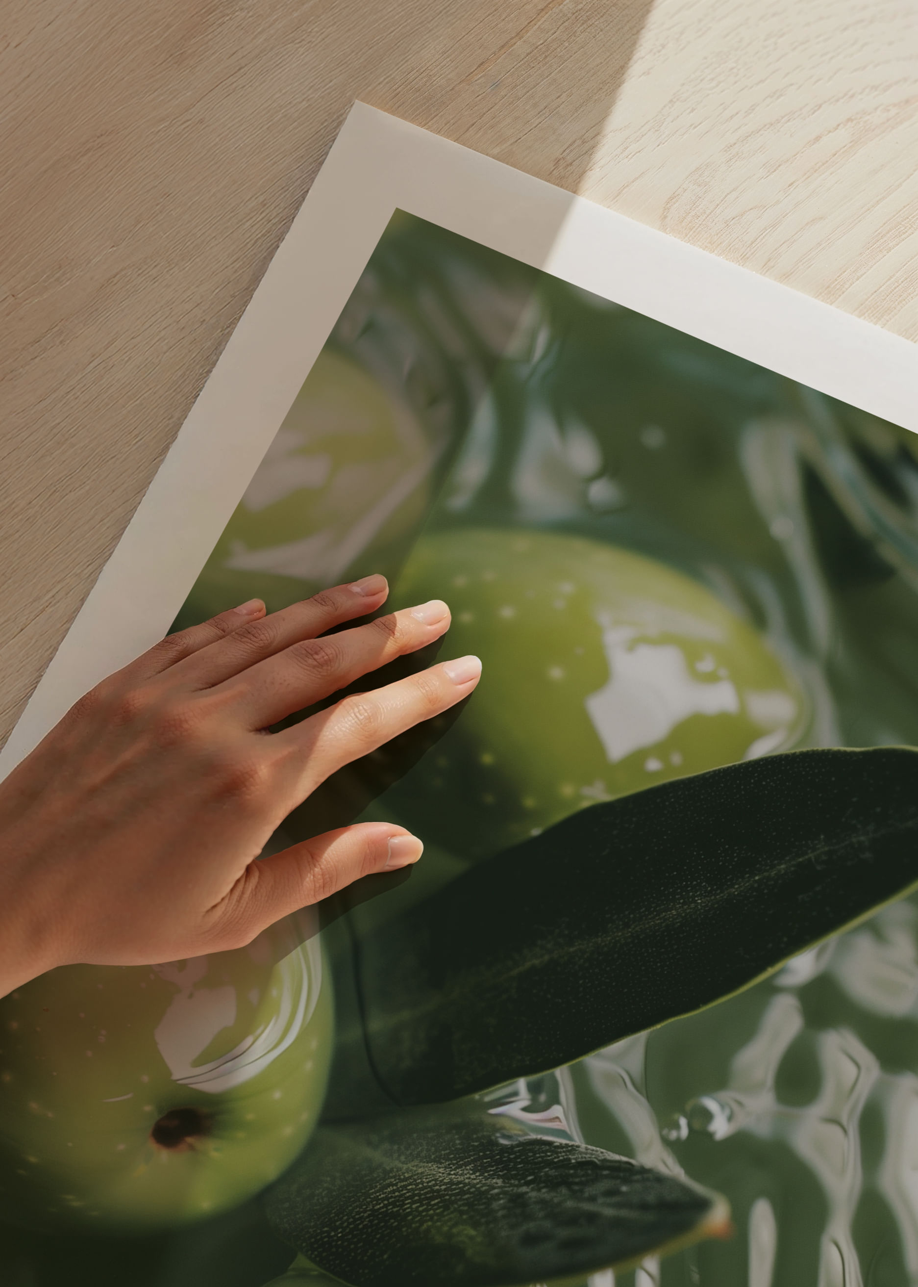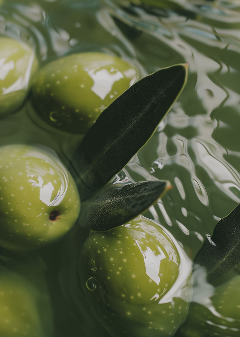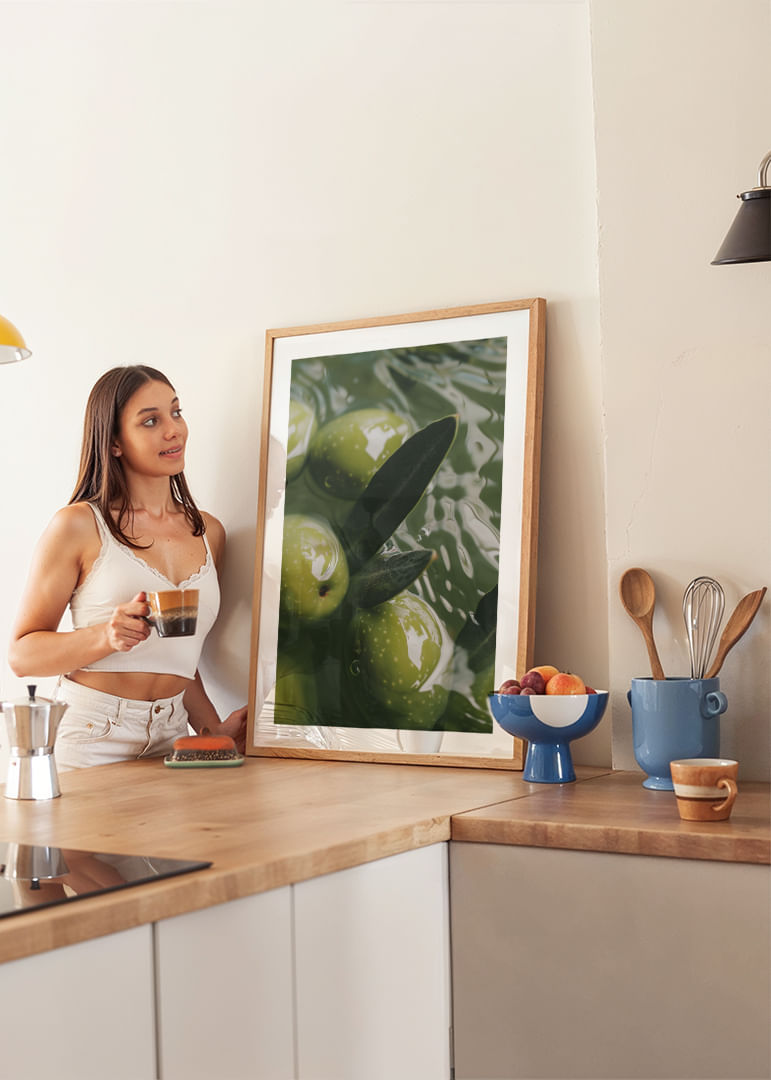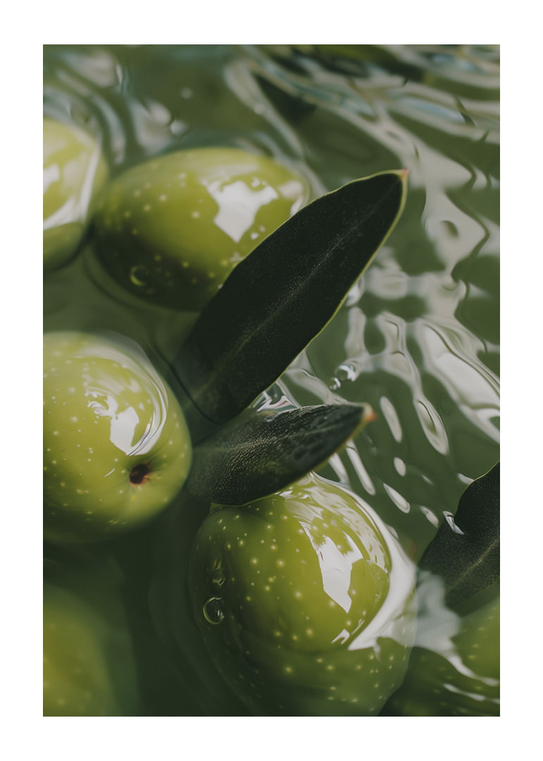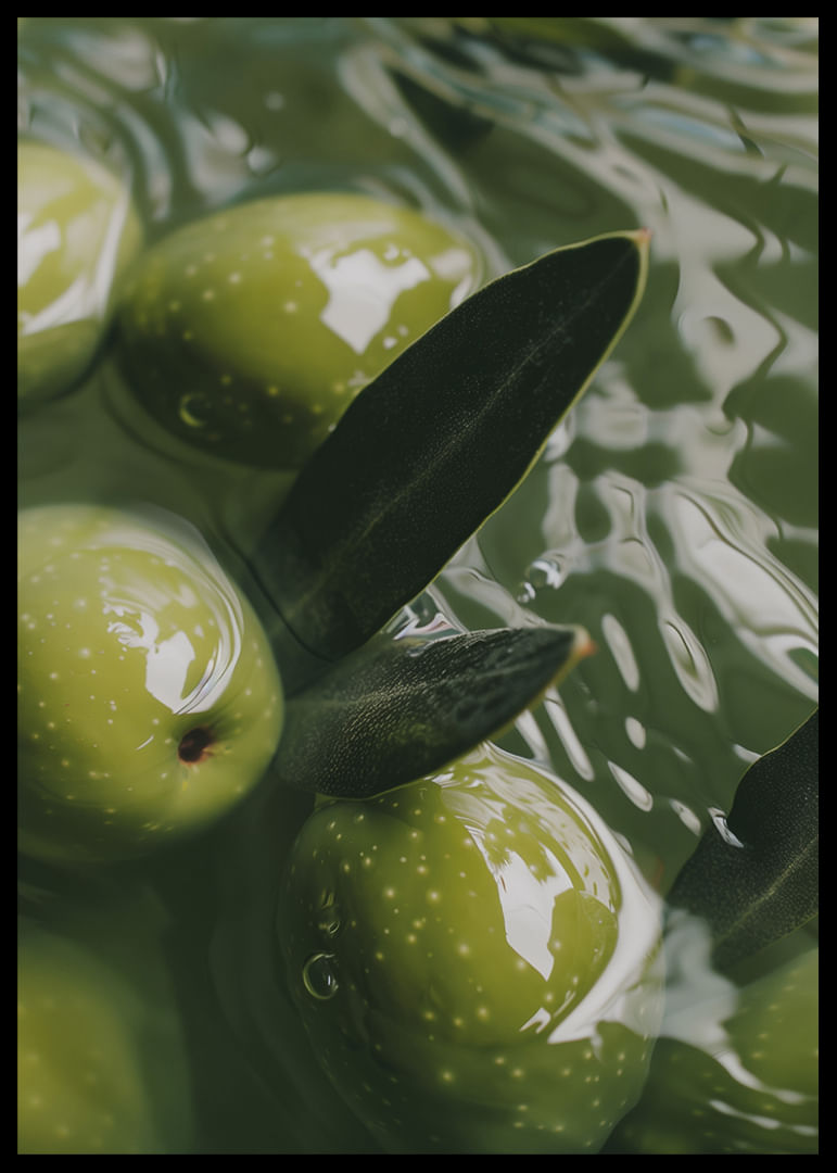 This poster captures the soothing flow of olives delicately floating in emerald green water. The light plays on the surface, creating a sense of calm and harmony in the image. The olives are a rich green and the leaves add a touch of elegance. This poster transforms your indoor environment into a peaceful oasis, where every glance is reminiscent of the simple, timeless beauty of nature. Perfect for creating a meditative atmosphere.