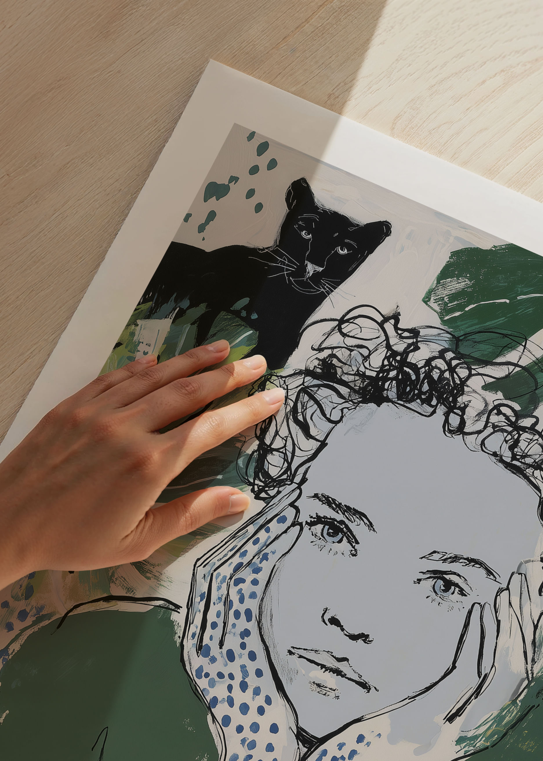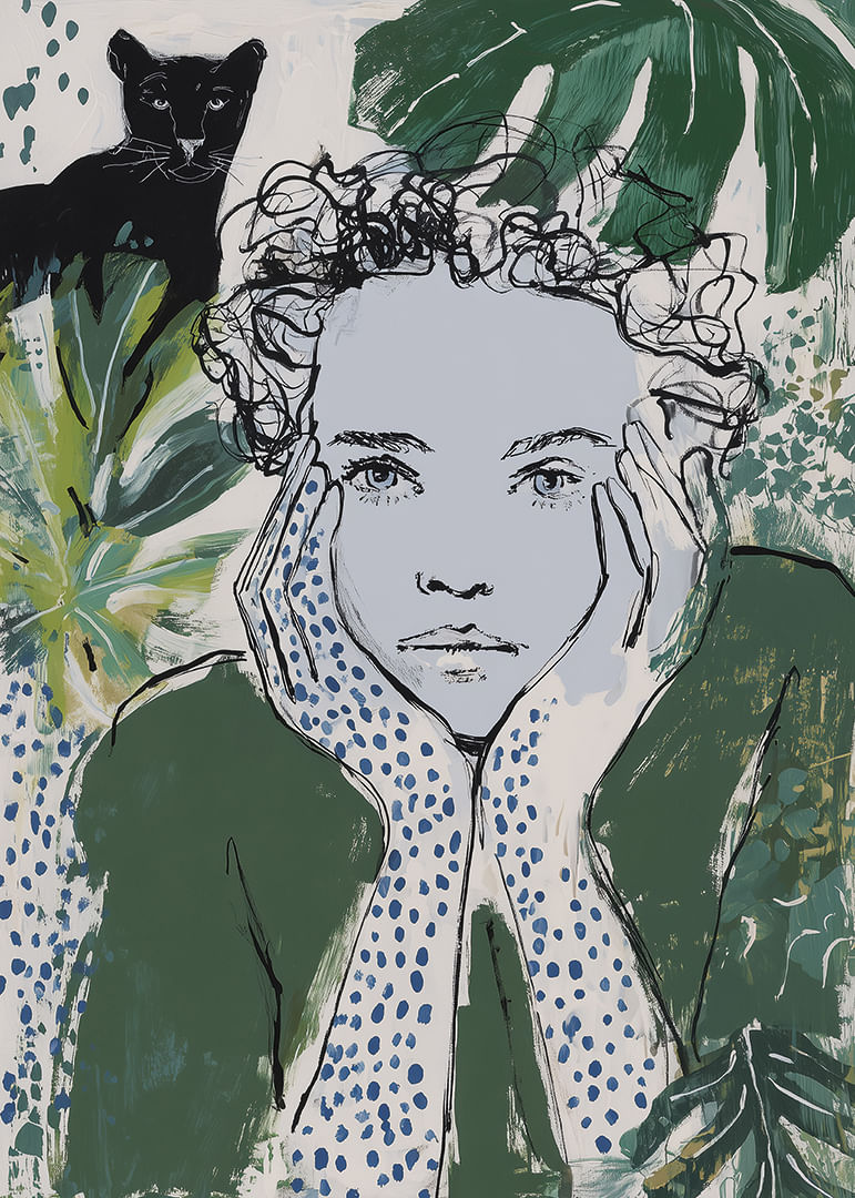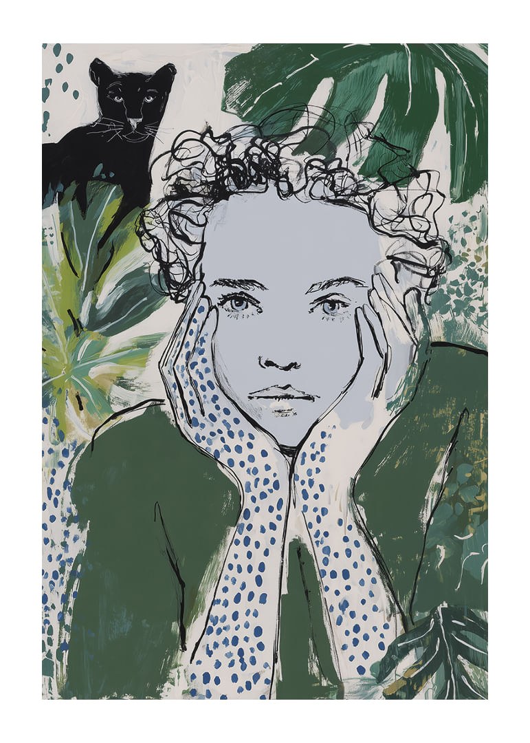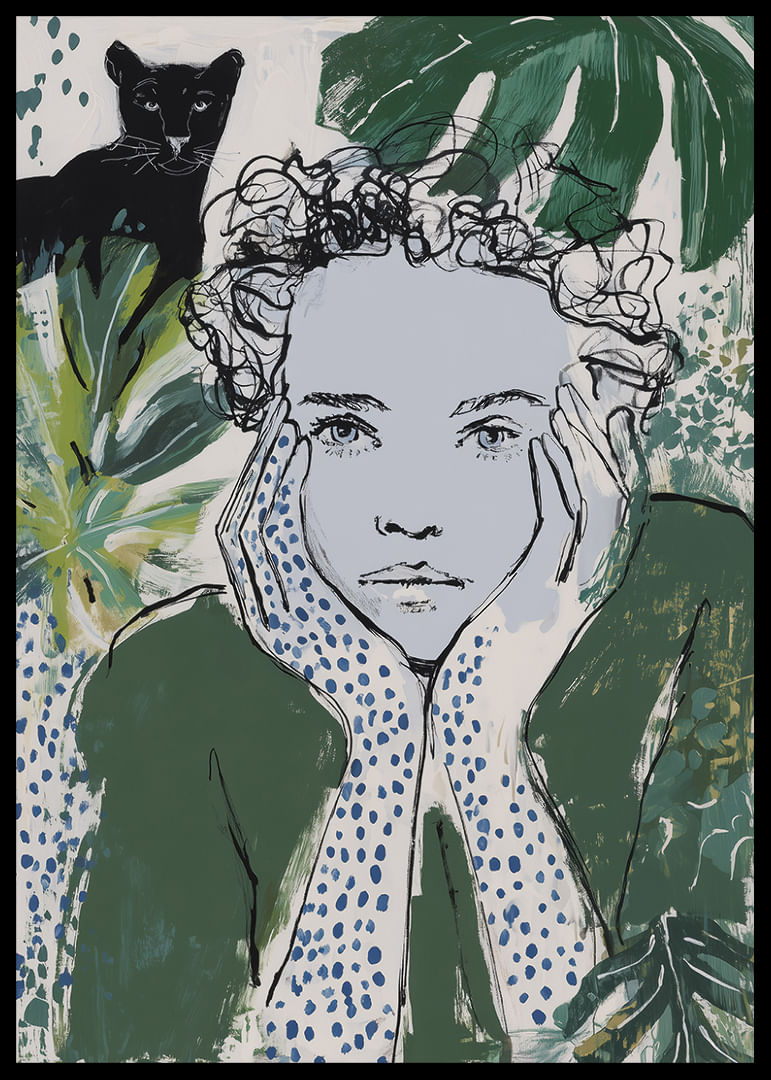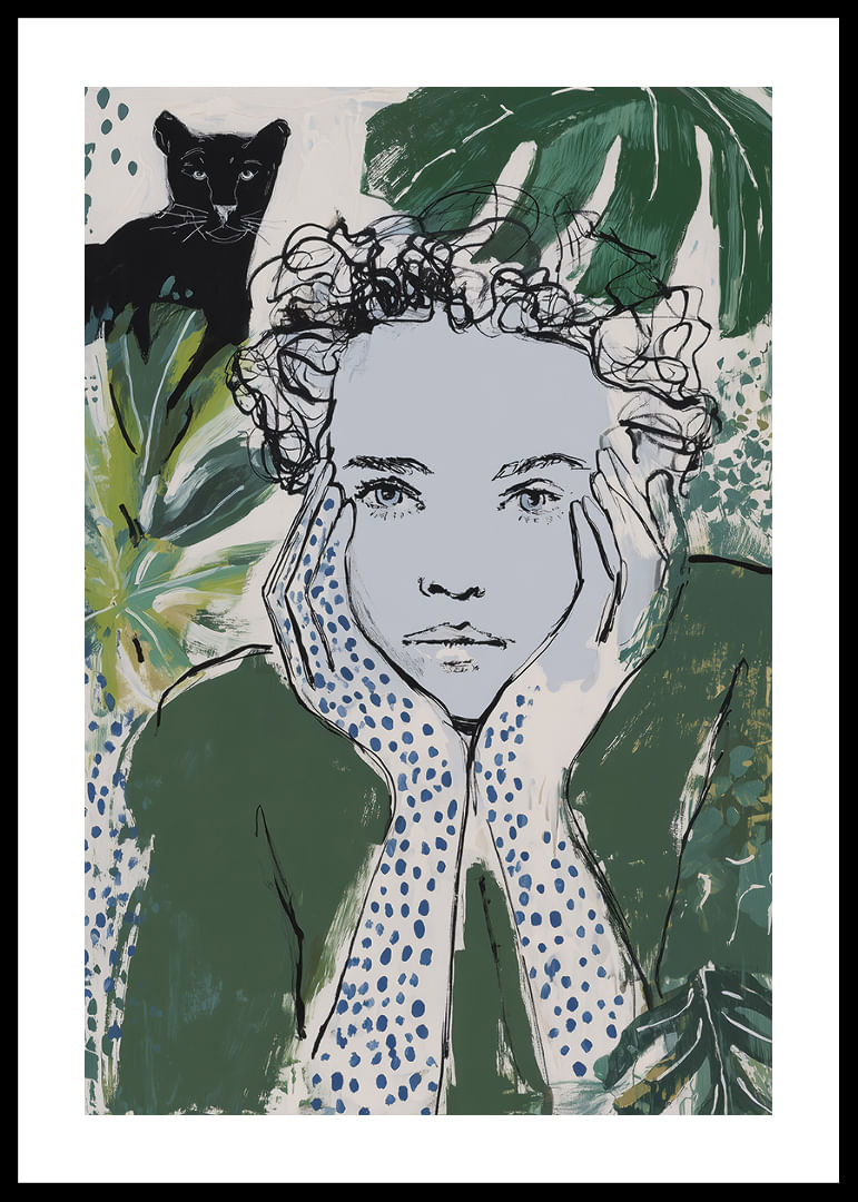 This poster captures a dreamy mood where a thoughtful person is surrounded by green leaves and plants, with a black panther watching in the background. Combined shades of green and blue create a mysterious yet calming atmosphere, perfect for bringing life to any room. The poster adds a touch of nature's tranquility and invites reflection and harmony into your home.