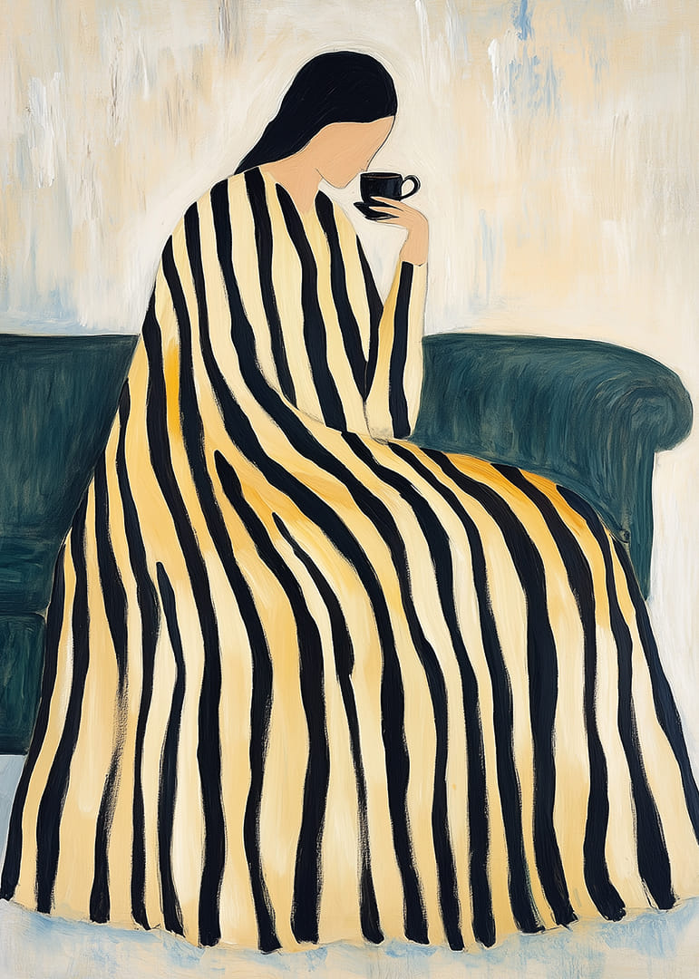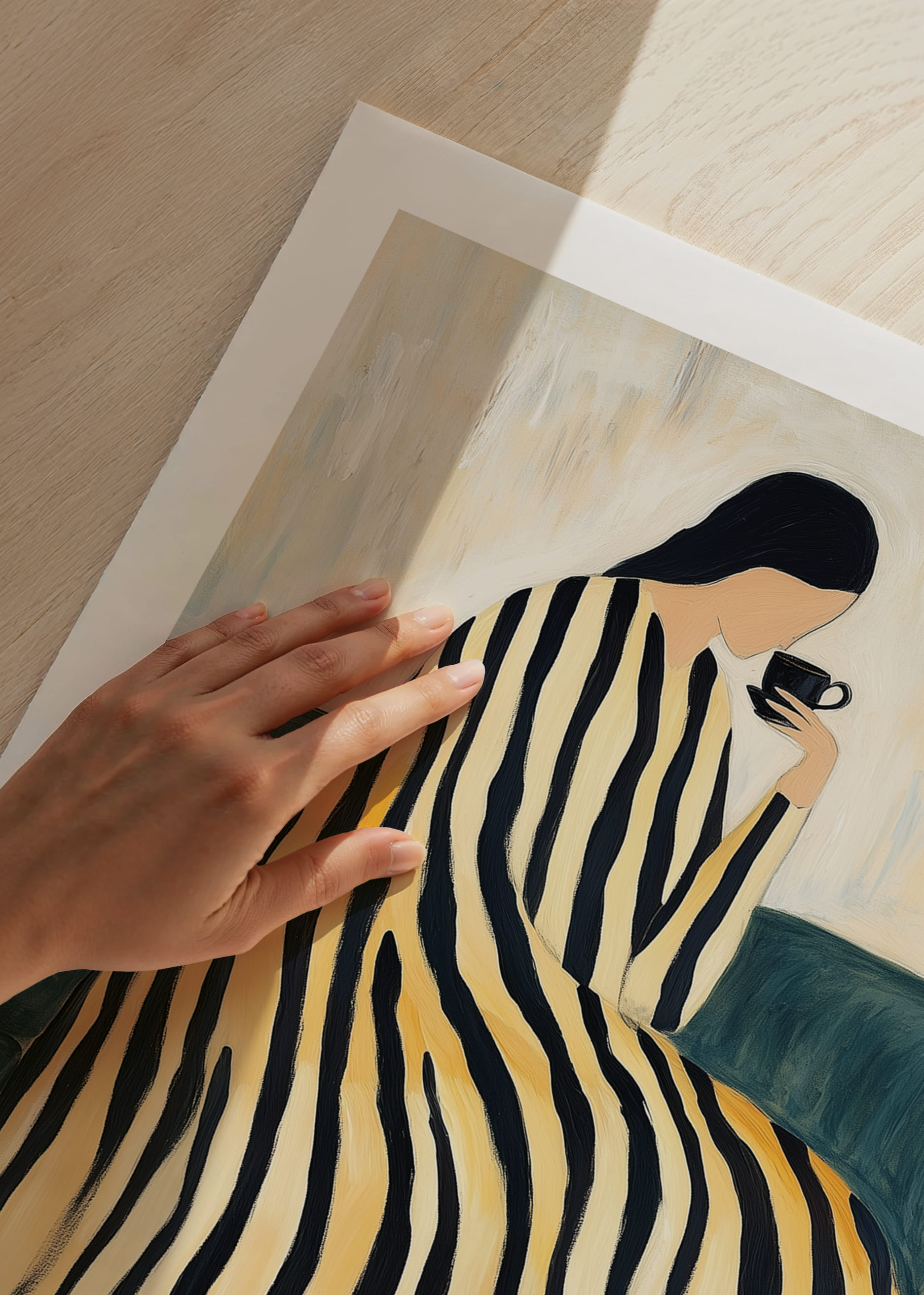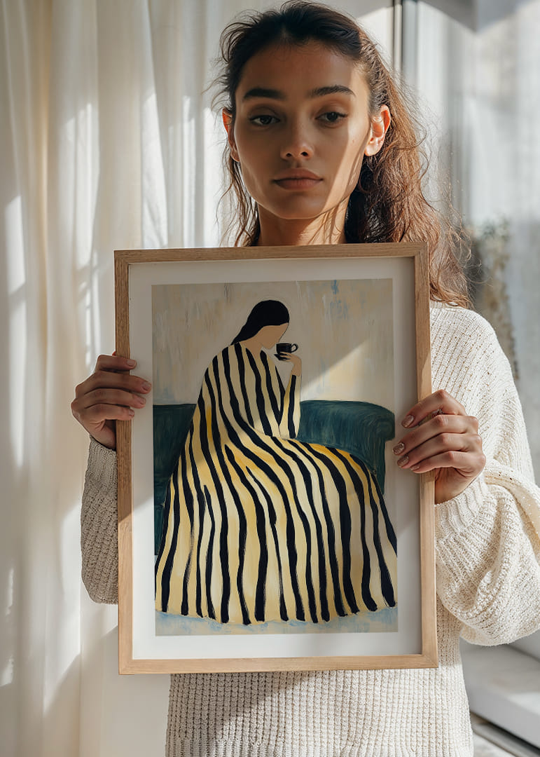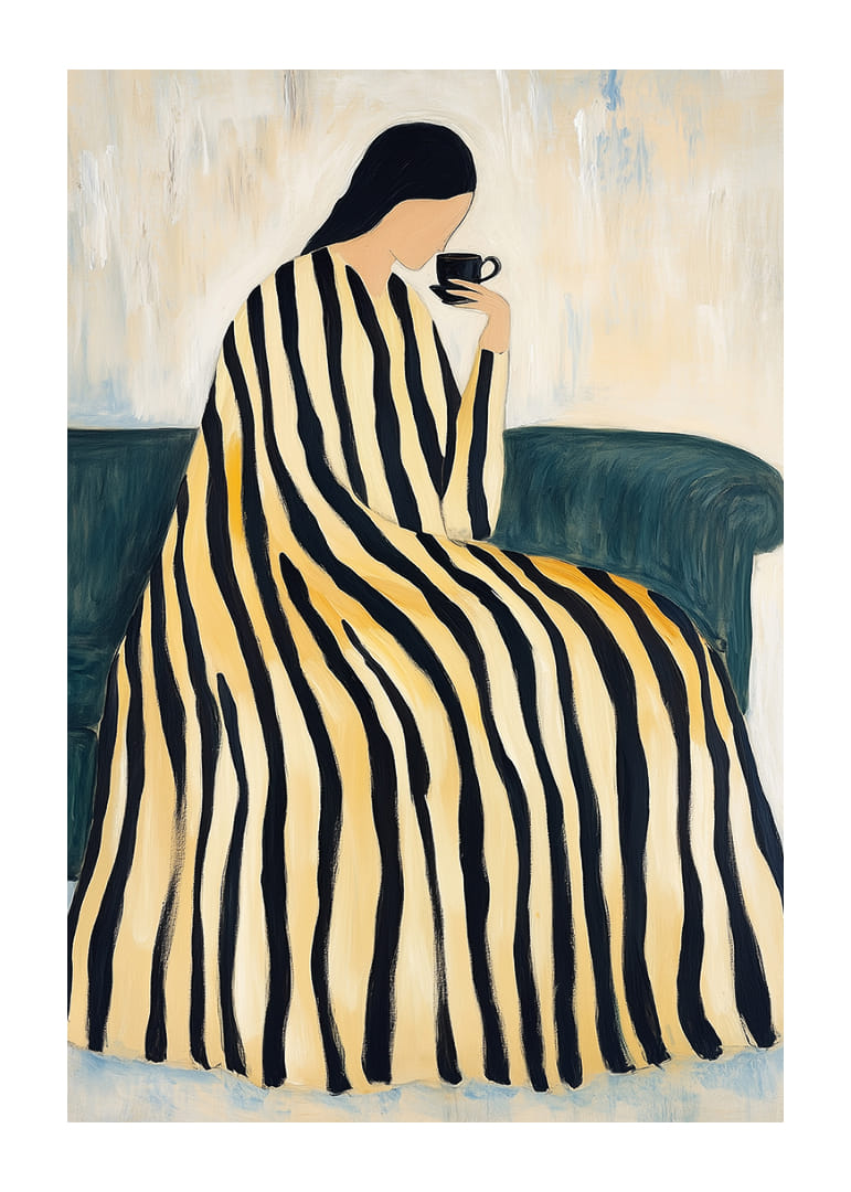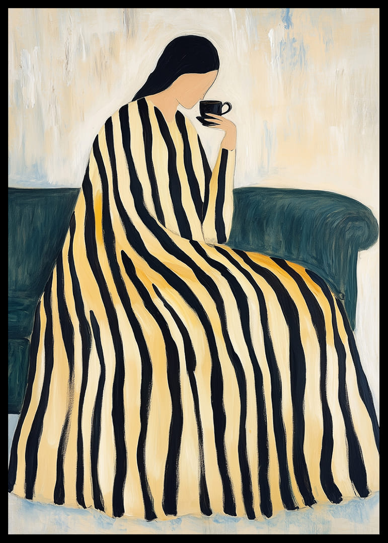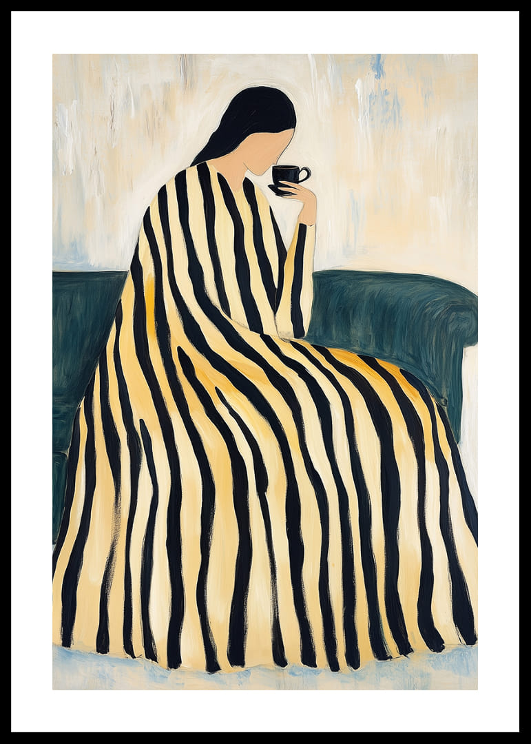 This artwork conveys a sense of calm and elegance. A woman wearing a striped dress sits gracefully on a sofa, enjoying a quiet moment with a cup of tea. This poster, with its contrasting colors and simplicity, creates an atmosphere of reflection and tranquility. Perfect for transforming a living room into a place of relaxation and sophisticated beauty.