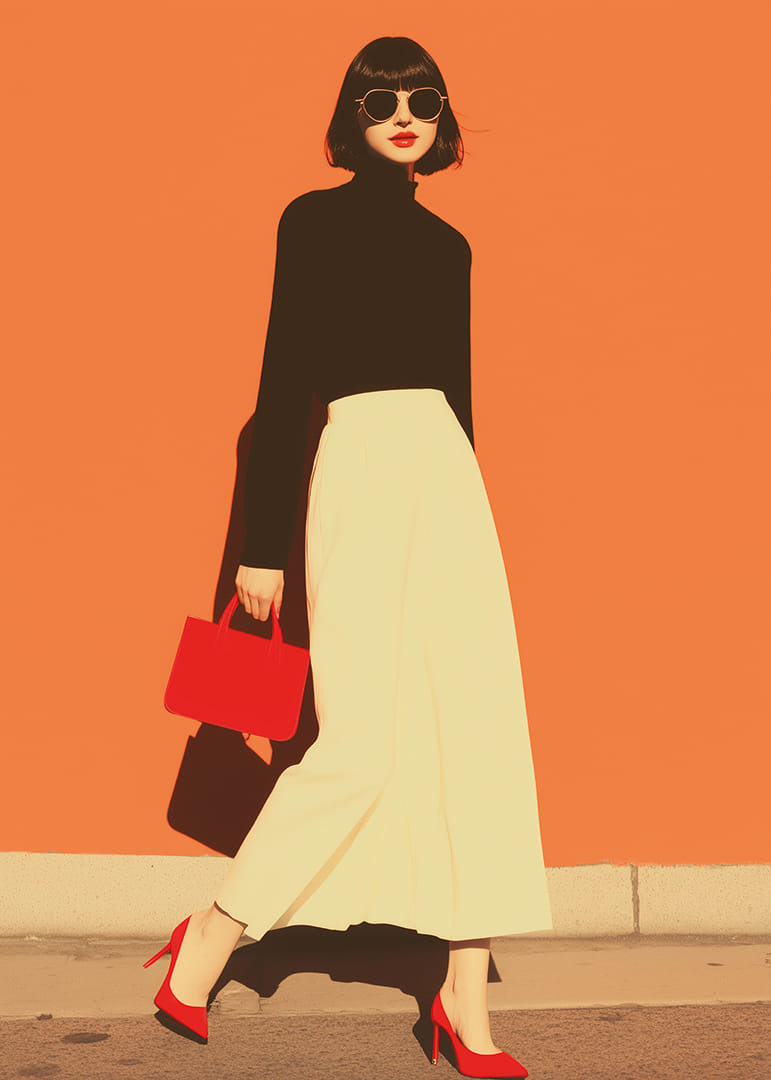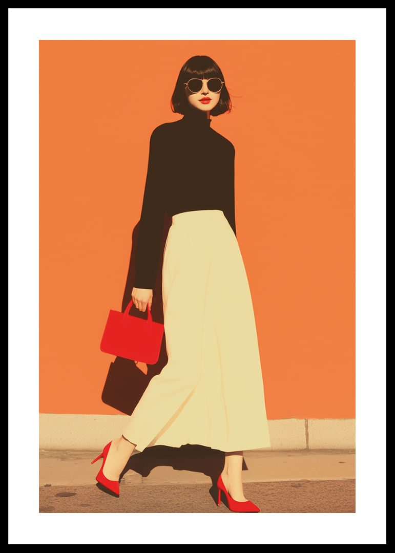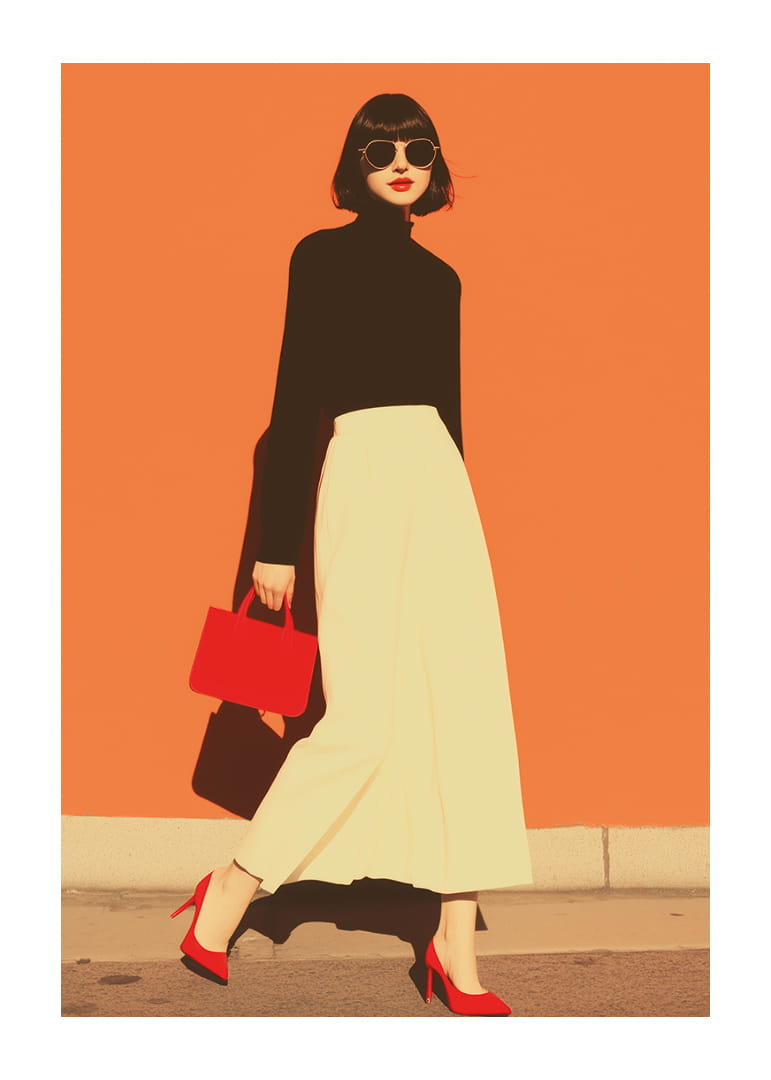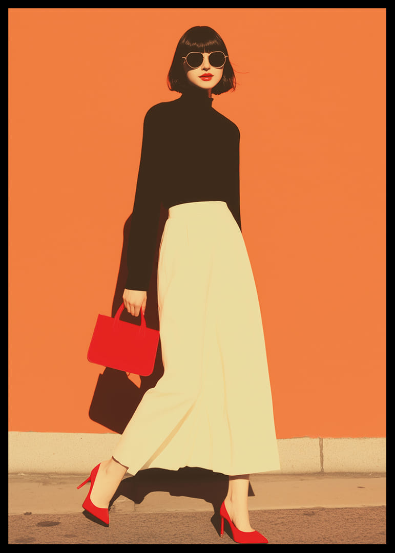 This poster emphasizes a dramatic contrast between bold colors and elegant lines. The sophisticated combination of red and beige tones creates an energetic and stylish atmosphere. The retro-inspired style of the image and the stylish pose add a timeless charm. By hanging this poster, your room will quickly become a place of artistic and modern expression, full of life and character.