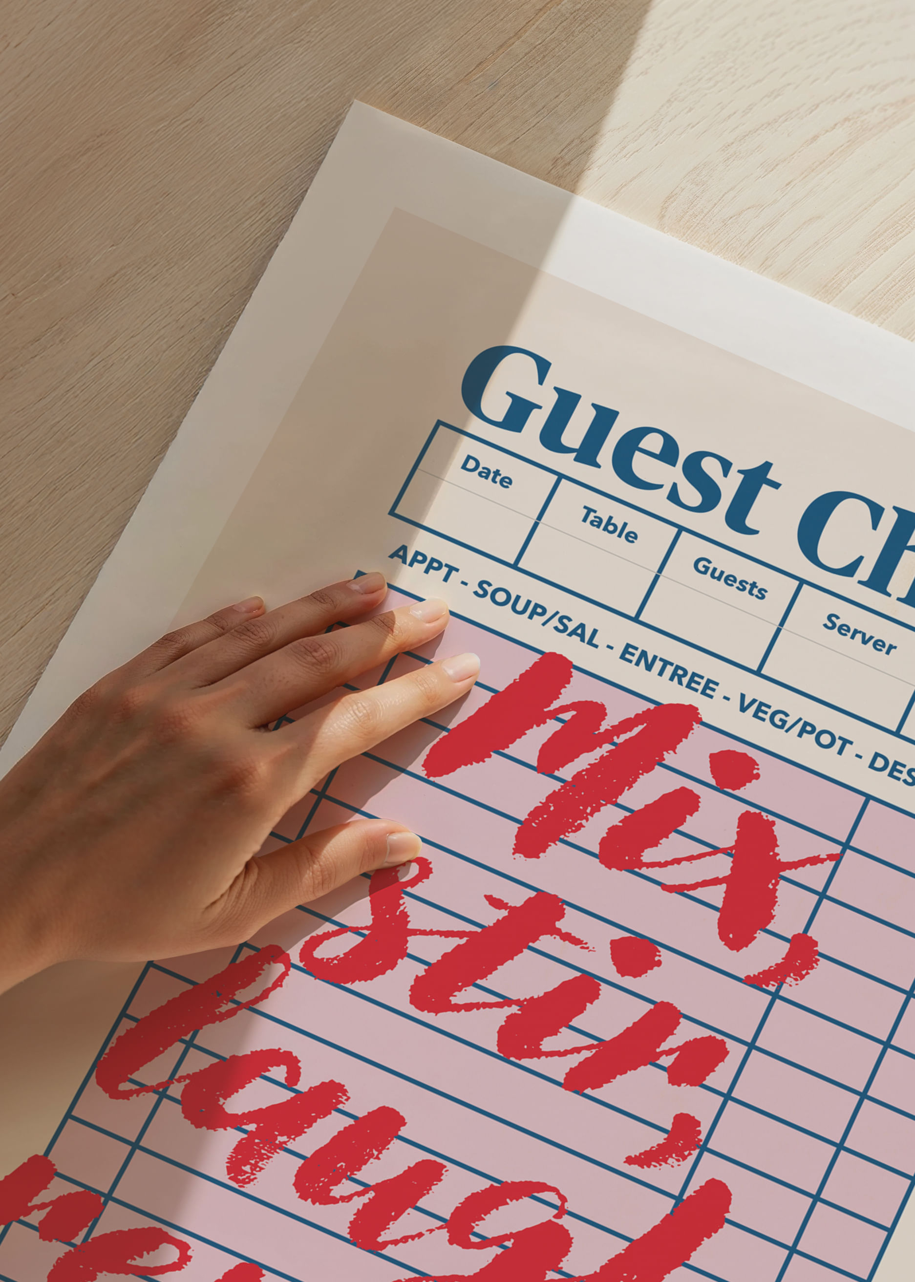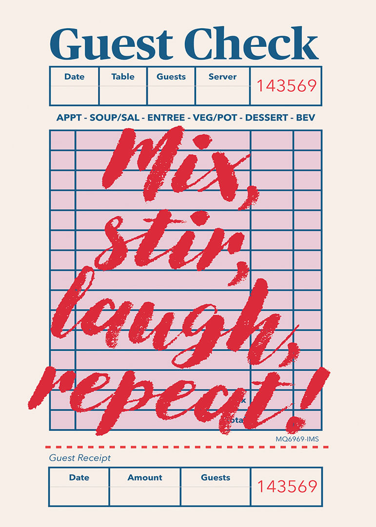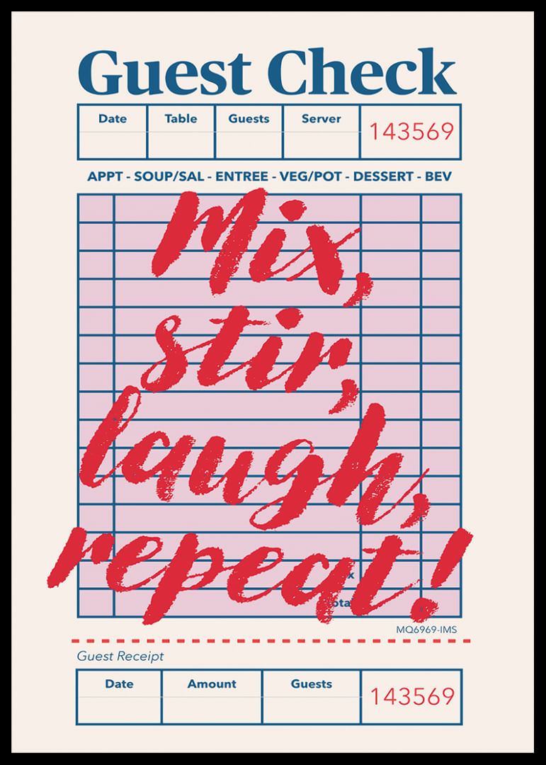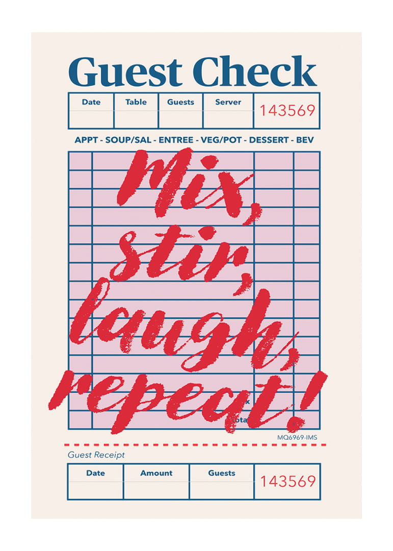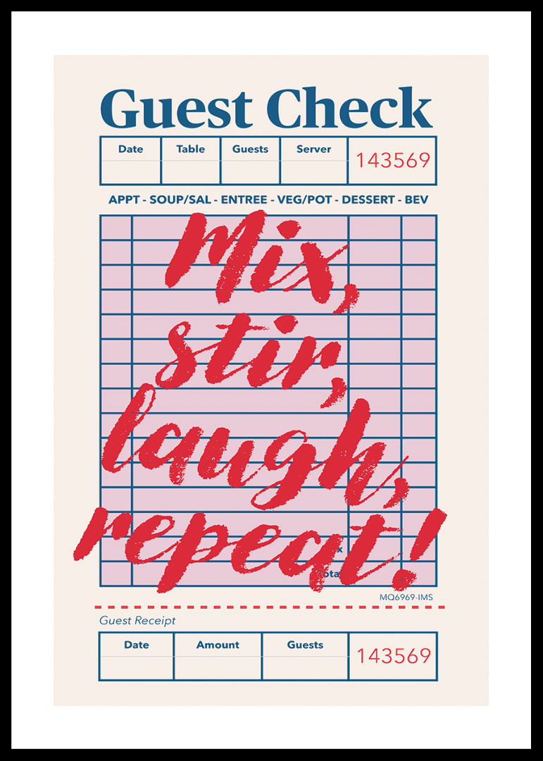 With lively energy and humor, this poster transforms the atmosphere of the kitchen. The playful, stylized letters are reminiscent of mixing, stirring and laughing - a recipe for joy in every meal. The warm red tones against a soft background add a charming touch. Perfect for those who love lively kitchen hours, this poster gives the room character and encourages laughter and good times.