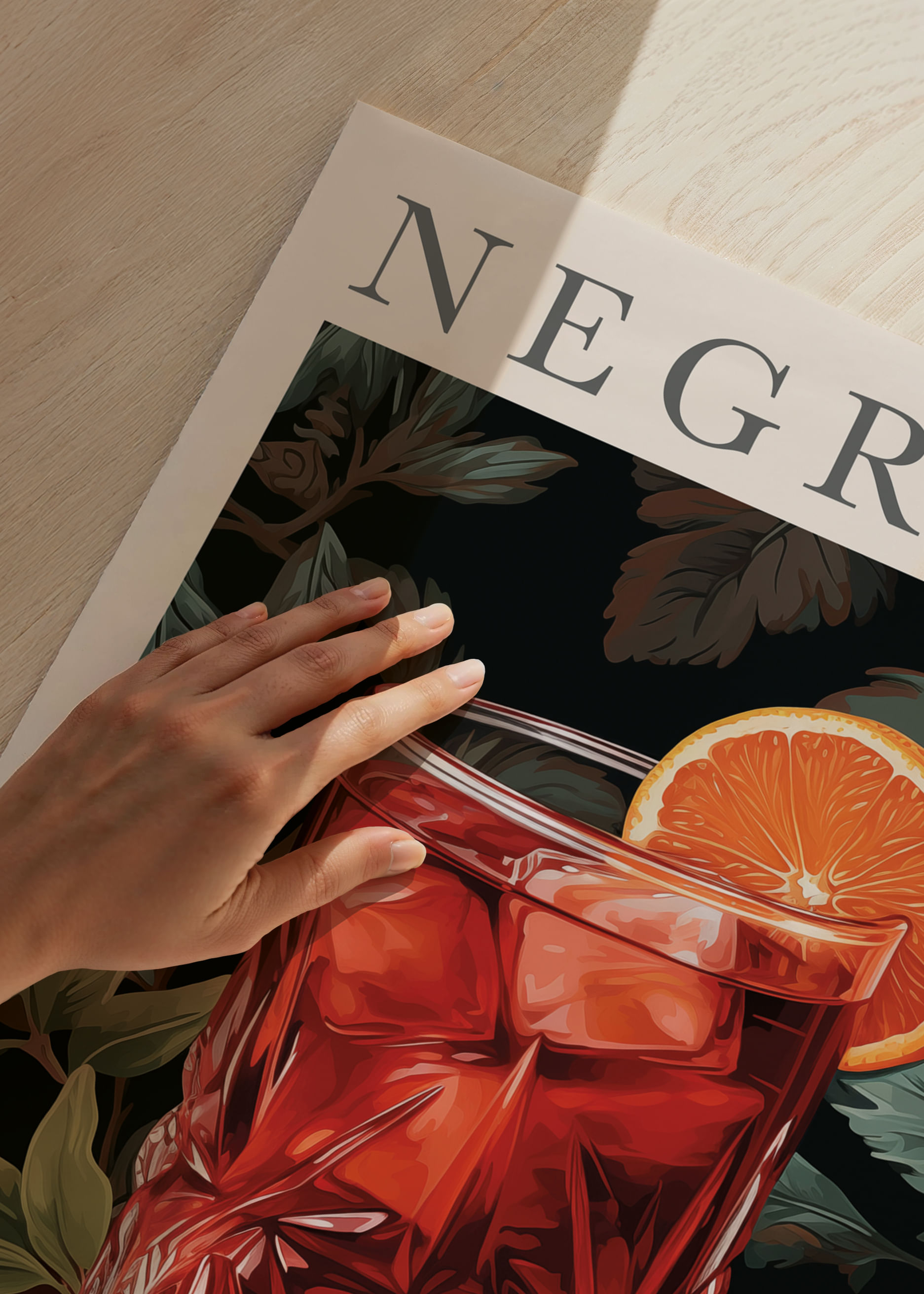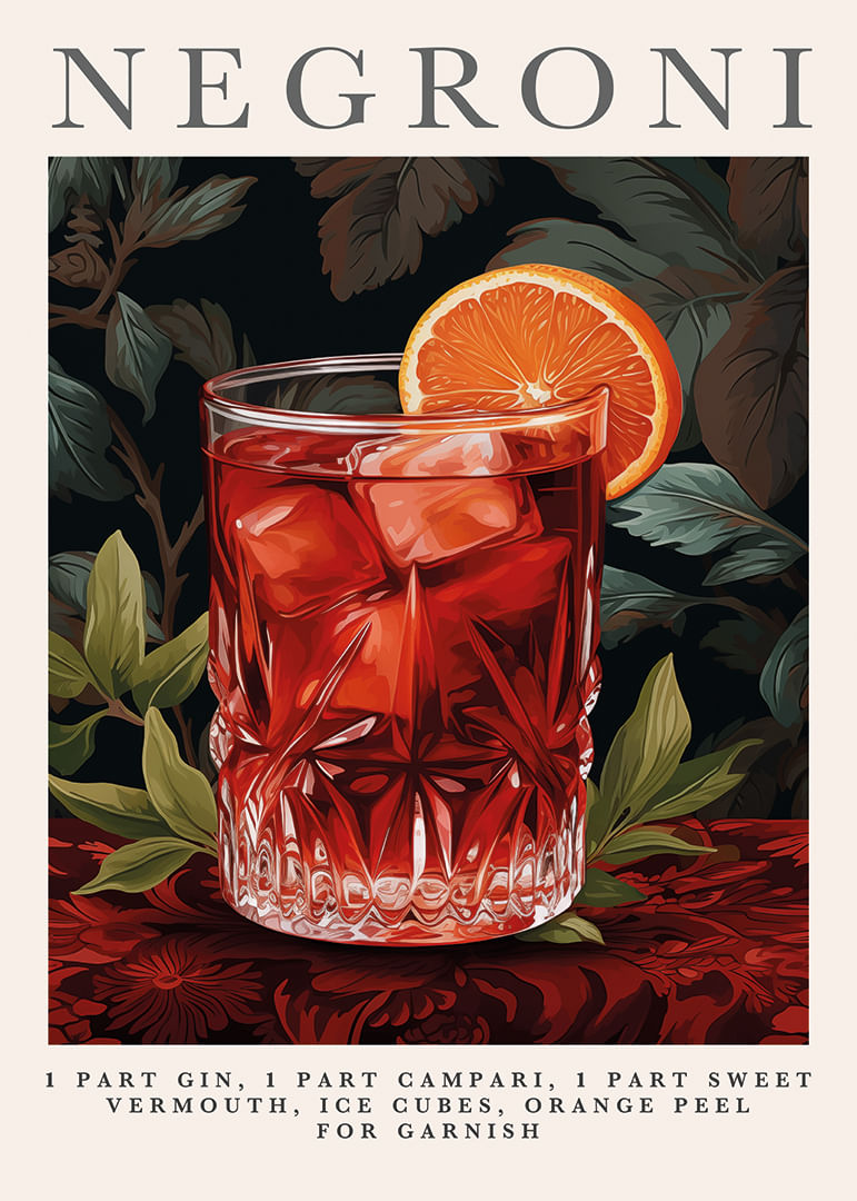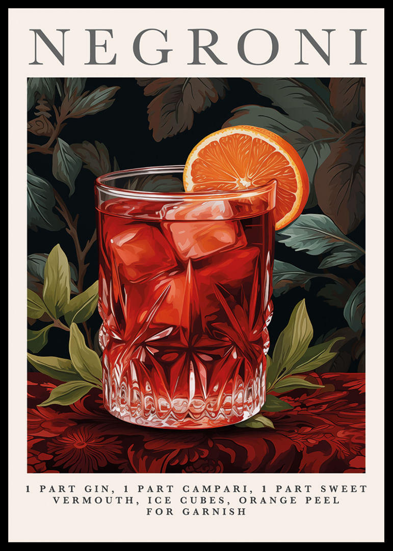 This poster captivates with its vibrant colors and intricate details, where a brilliant red negroni balances against a backdrop of lush greenery. The refreshing citrus aroma almost seems to emerge from the glass. A perfect balance of elegance and modernity, this poster will elevate the atmosphere of any room and add a sense of tasteful luxury and passion.