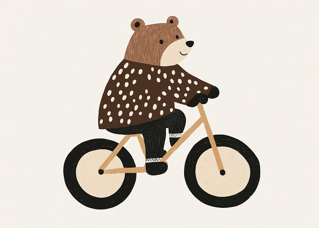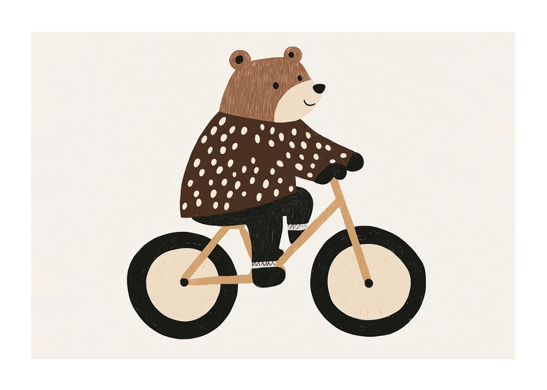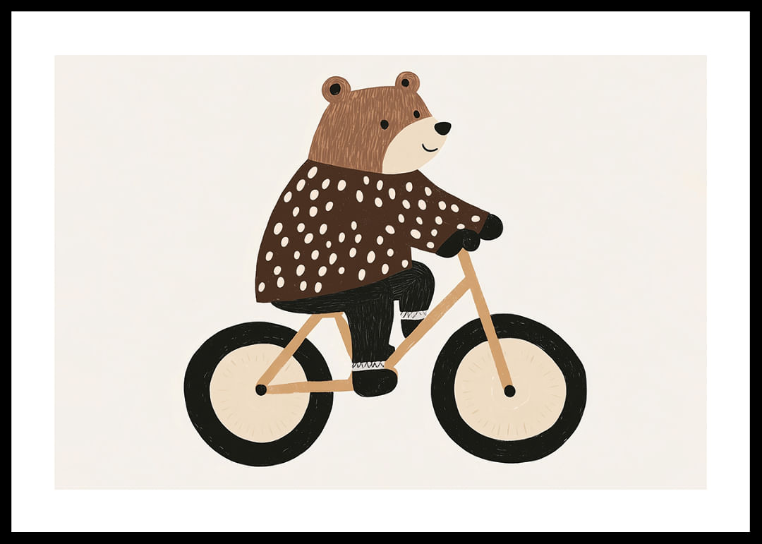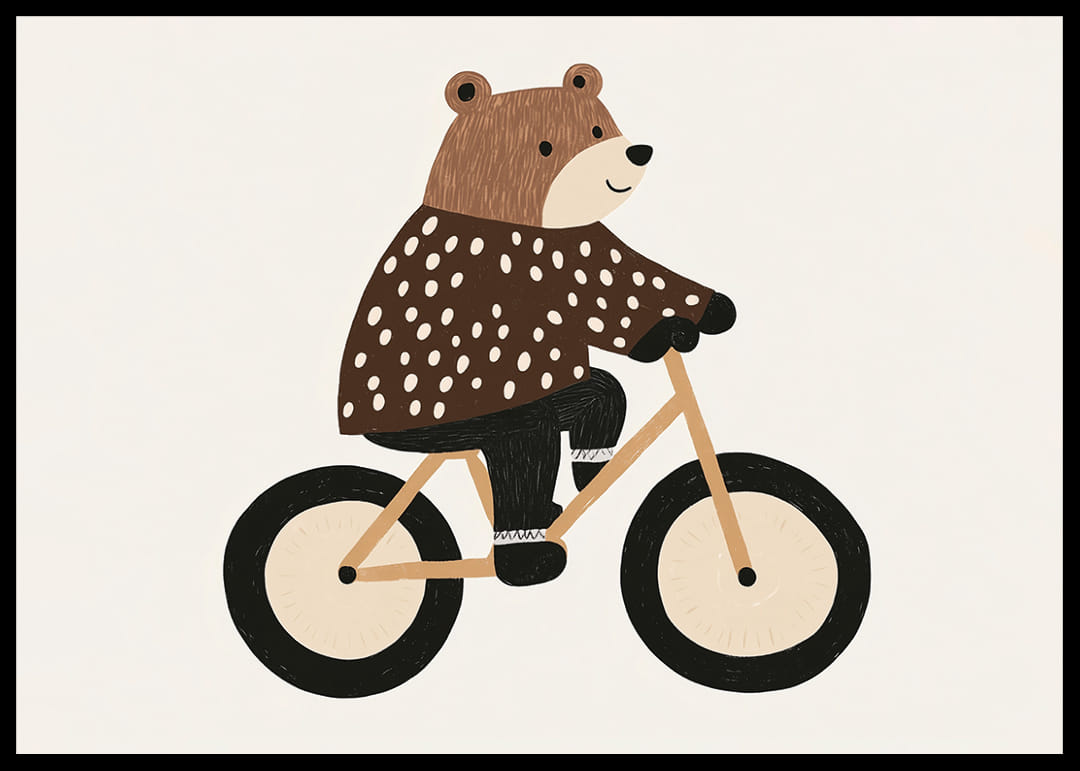 This poster with the charming bear on a bicycle captures the heart with its playful design. Warm colors and beautiful detailing give a feeling of movement and freedom. The bear's sparkling eyes and mouth spread an infectious smile that creates a positive atmosphere. Perfect for a child's room, where the poster can inspire many imaginative adventures and add a lovely, happy energy to the room.