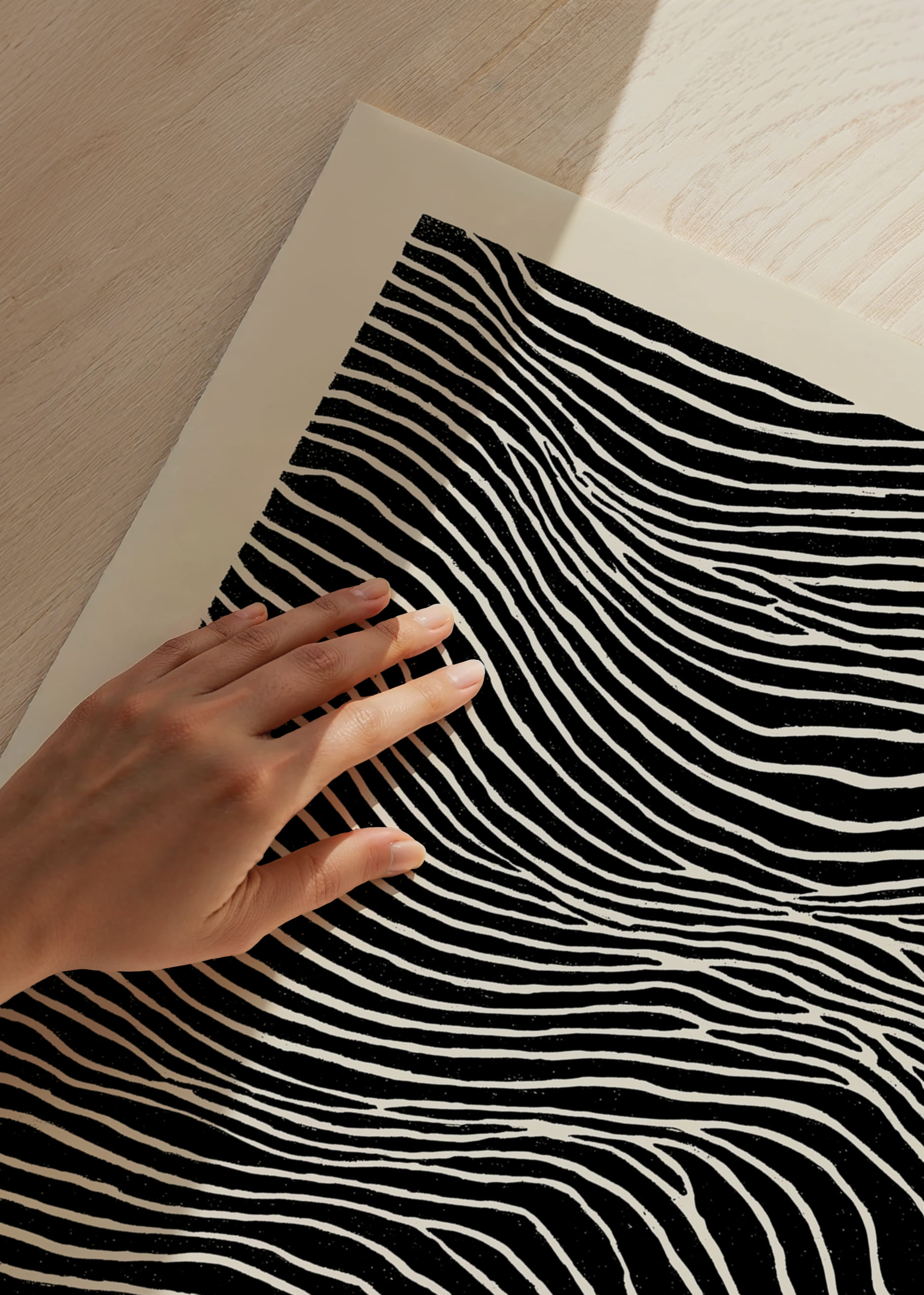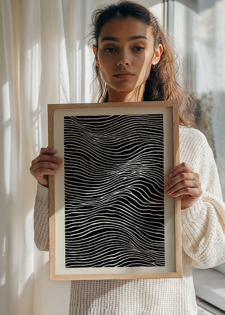 This poster captivates the viewer with its elegant black and white lines that form an undulating pattern of movement and harmony. The simple yet powerful design highlights the contrasts and creates a sense of depth and rhythm. This hypnotizing poster will make a stylish and contemporary addition to any room, adding a unique touch to its atmosphere.