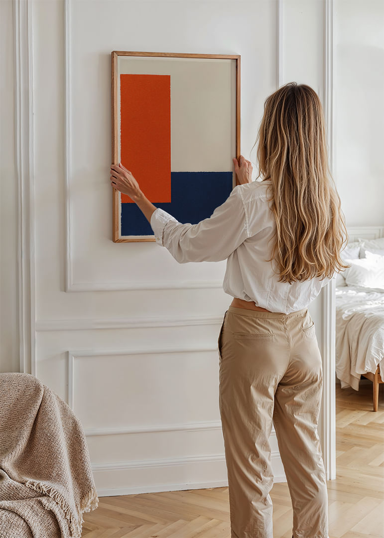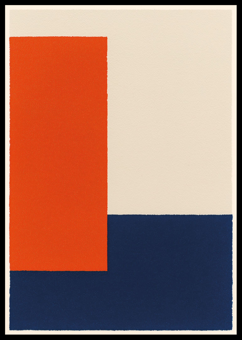 This poster immediately catches the eye with its perfect balance of color and shape. The bold orange and blue fields create a dynamic that gives a sense of both energy and stability. The clean lines of the minimalist design highlight the power of simplicity and make this poster ideal for lifting any room. It is a work of art that will instantly elevate the style of your home.
