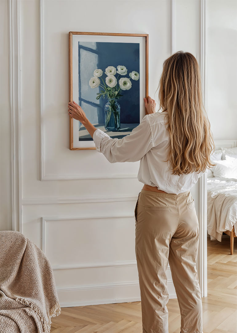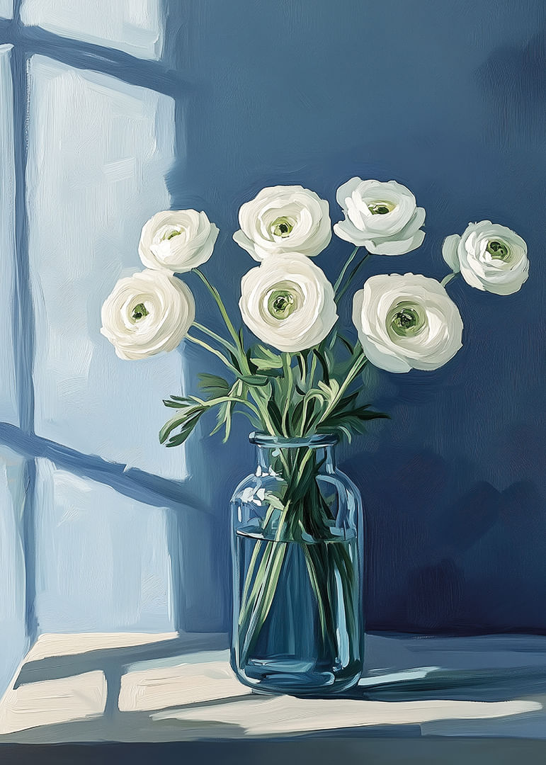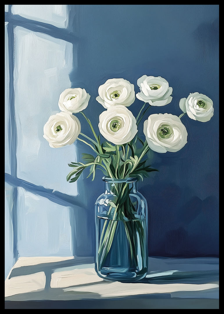 A sense of calmness radiates from this poster, where white flowers are elegantly arranged in a bright blue vase against a muted blue background. The light from a window casts soft shadows, creating an atmosphere of tranquility and grace. This poster becomes a calming focal point in the room, offering a perfect balance between nature and modern simplicity. An ideal piece of art to enhance your home with serenity and beauty.