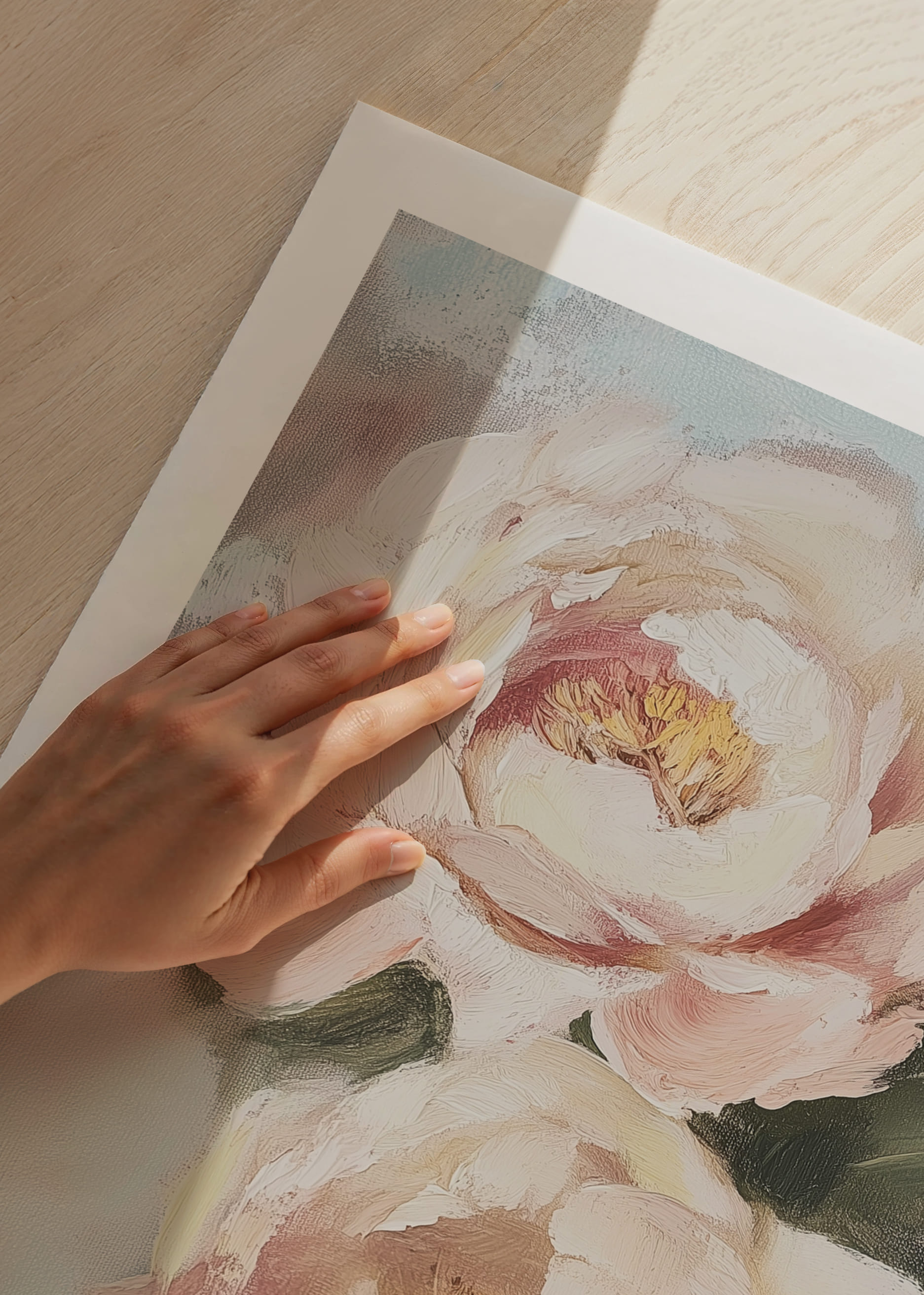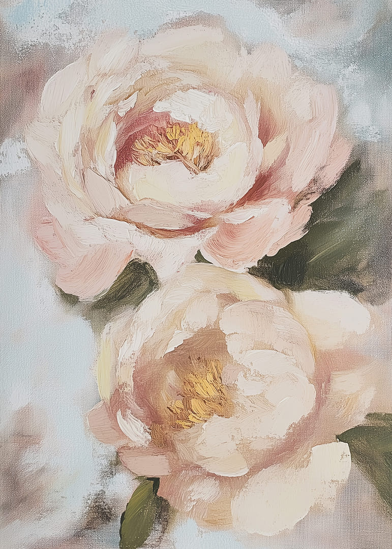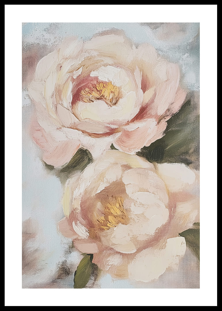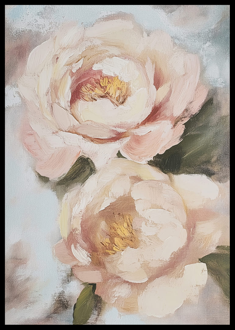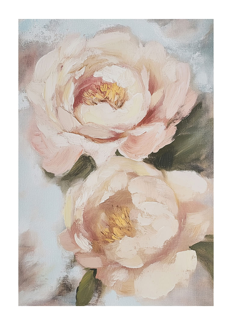 The magnificent blooms of peonies sweep into a world of soft pastels, where every brushstroke captures their delicate beauty. This poster, with its subtle shades of pink and creamy white, exudes elegance and tranquility. Perfect for giving a room a sense of timeless grace, where the calming energy of the flowers invites quiet contemplation and harmony. A true delight for the eye.