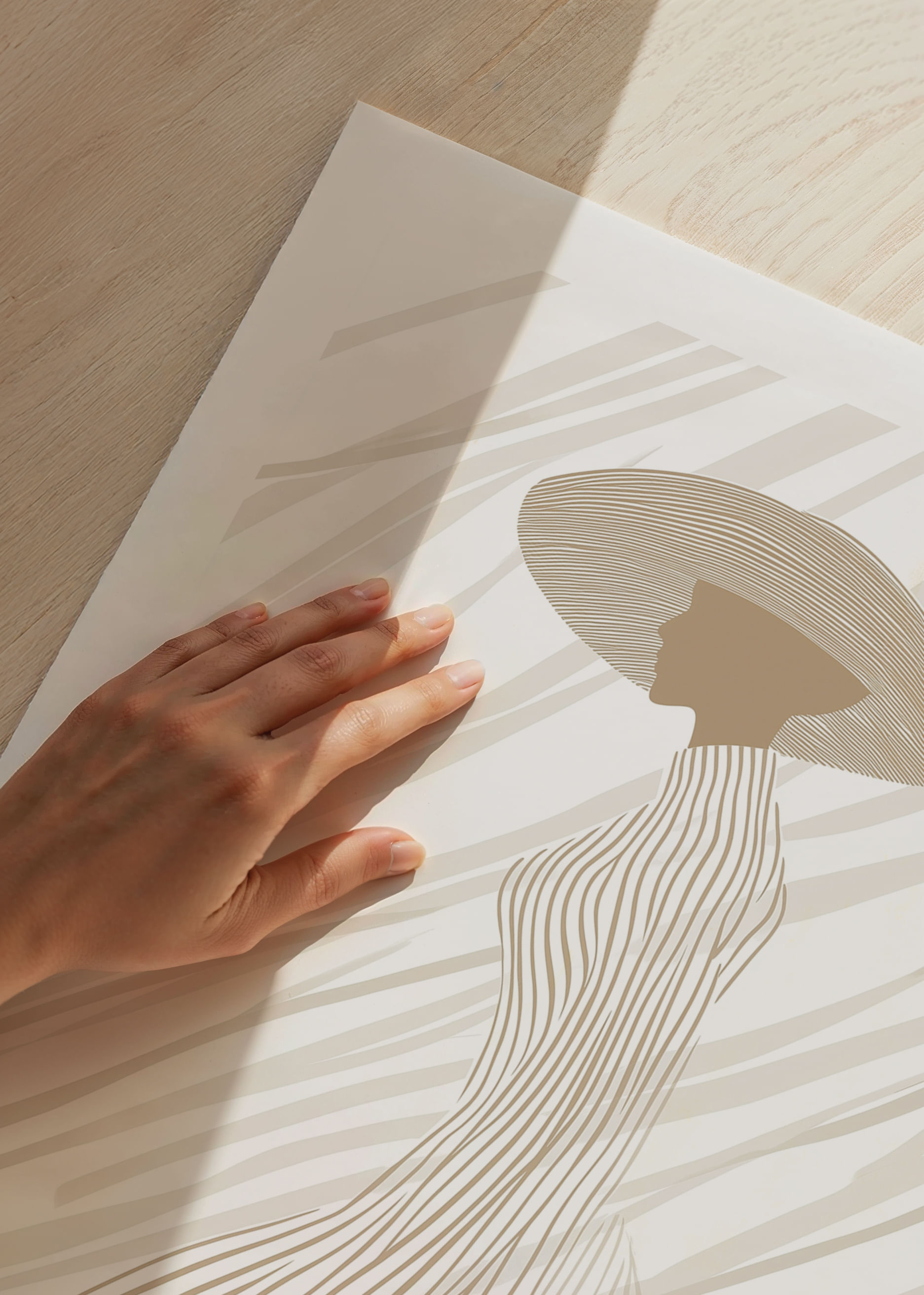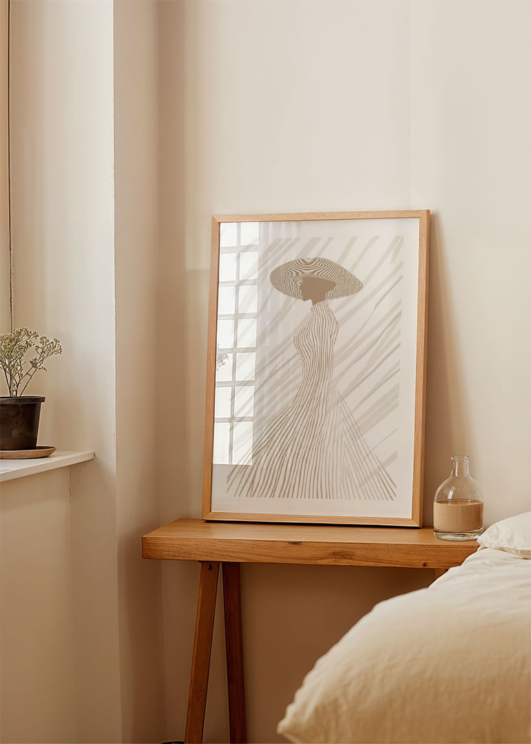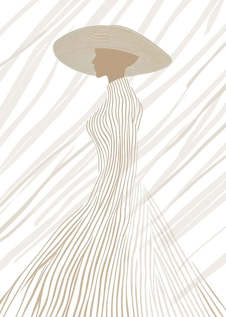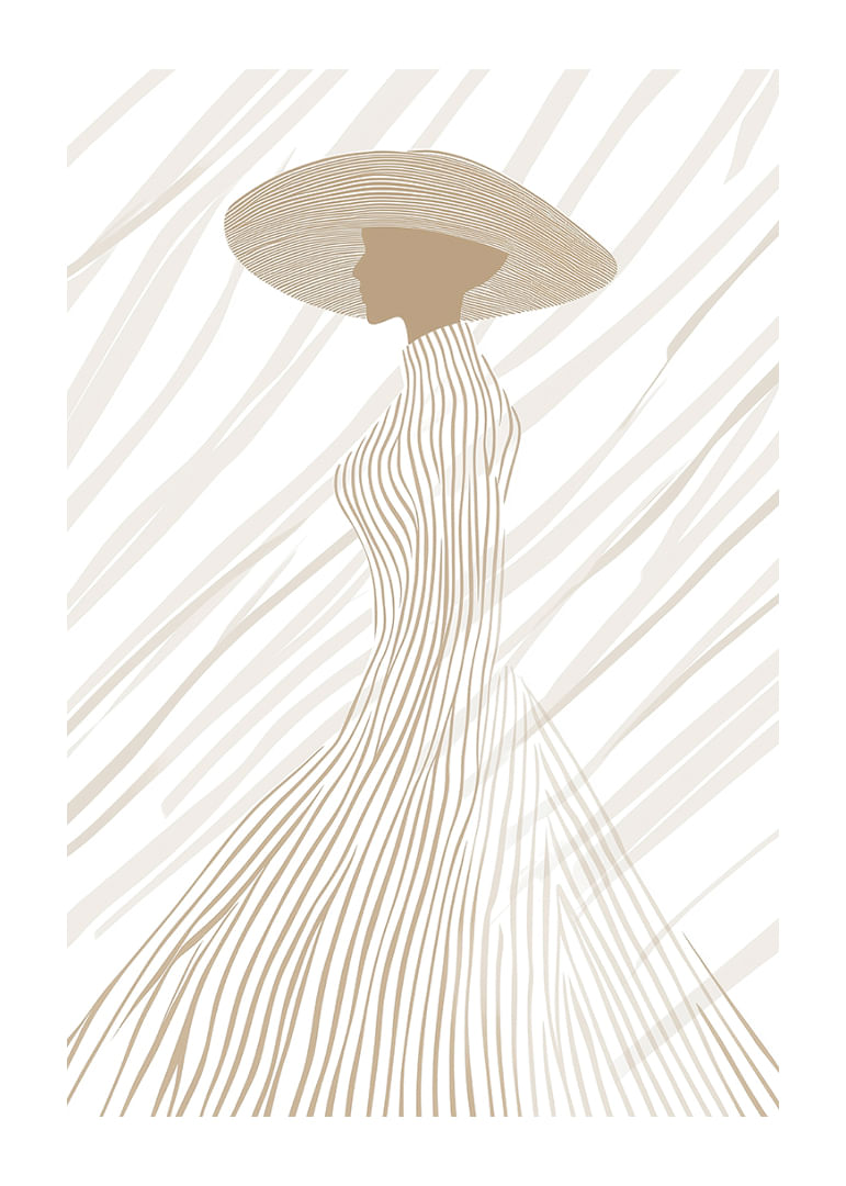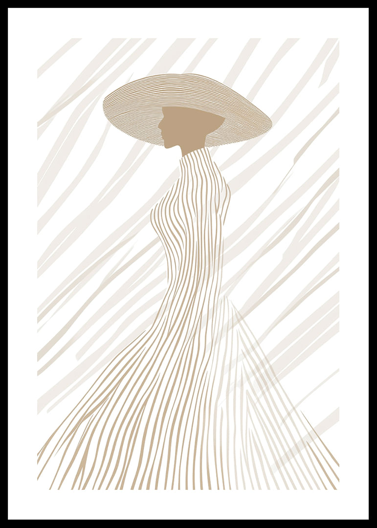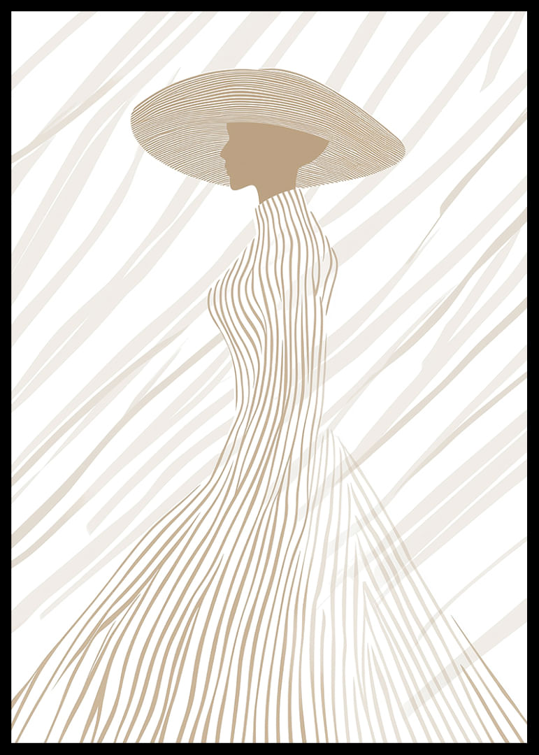 This poster captures an elegant silhouette, dressed in soft, neutral tones and subtle lines that flow harmoniously from hat to dress. The minimalist design highlights the beauty of the form and creates a calm and sophisticated atmosphere. Perfect for lifting a room with a modern feel and giving it a touch of timeless elegance, where every detail of the poster exudes style and fine taste.