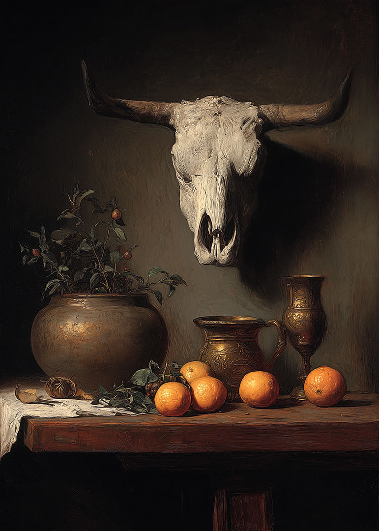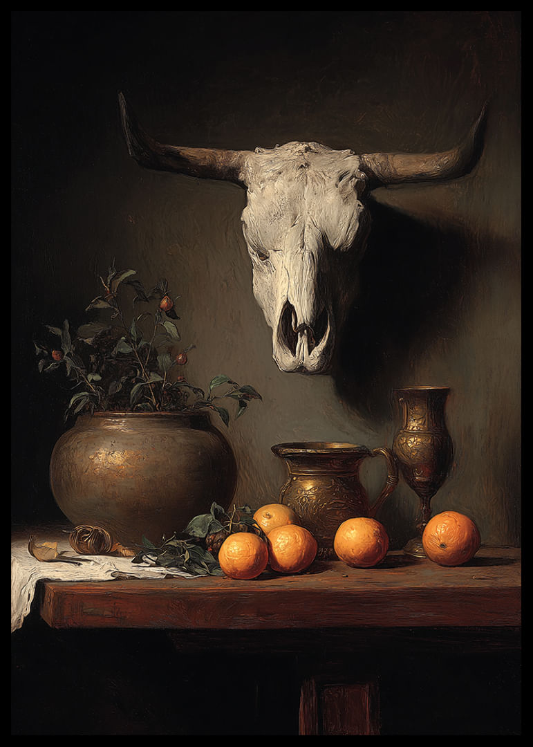 This poster captures a timeless and rustic feel with its arrangement of objects from the past. A skull, some cups, and beautiful oranges create a visual story on a simple wooden surface. The muted color palette contributes to a calm and peaceful atmosphere, perfect for giving your living room a hint of antique charm and visual depth. A poster that touches and inspires.