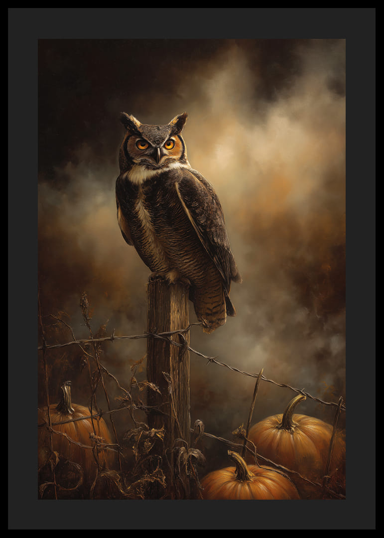 This mesmerizing poster captures a majestic owl perched on a wooden post surrounded by warm autumn colors. The owl's intense gaze and the glowing pumpkins create a mystique that draws the viewer into another world. The dramatic atmosphere of the image is enhanced by the subdued lighting and dark tones, making this poster a perfect addition to a room in need of a sense of autumn mystery.