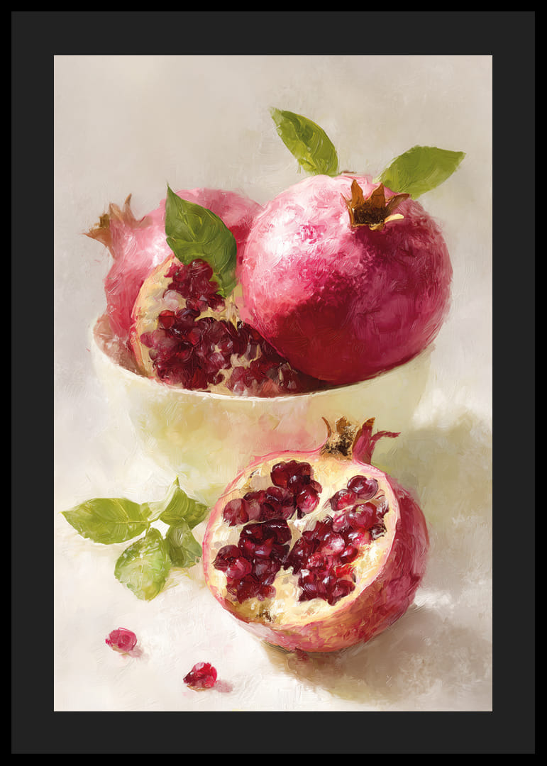 This poster captures the vibrant beauty of pomegranates with their ruby ​​red seeds and fresh green leaves. The colors dance against a light background, creating a sense of natural richness and energy. This poster not only enhances your wall with a touch of nature's magic, but also brings the room to life with its vibrant tone and visual joy.