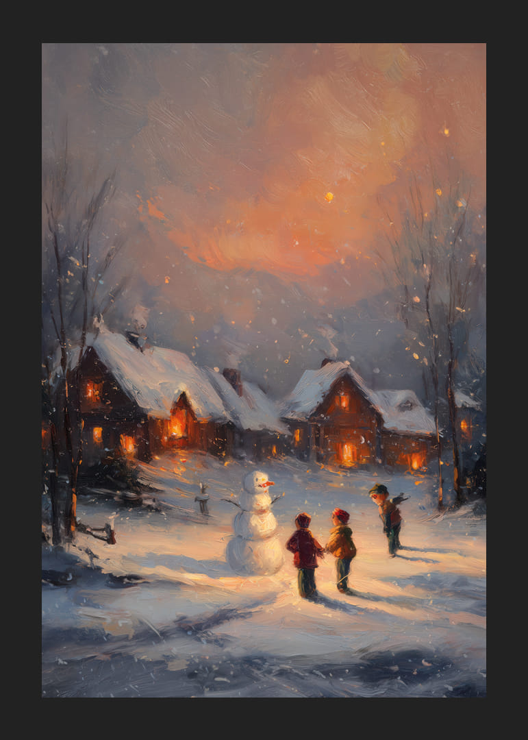 This poster captures the magical feeling of a winter evening where children build a snowman under a starry sky. The warm lights from the surrounding houses create an inviting contrast to the cold snow. With every brushstroke it reflects cold and warmth, peace and life. This poster transforms your room into a place of winter idyll and nostalgic shimmer, where every moment feels inviting and soothing.