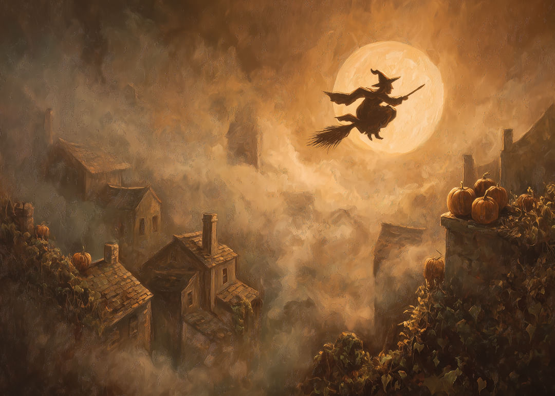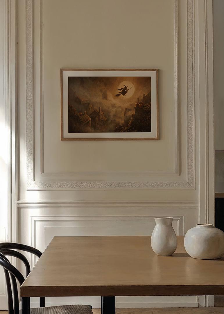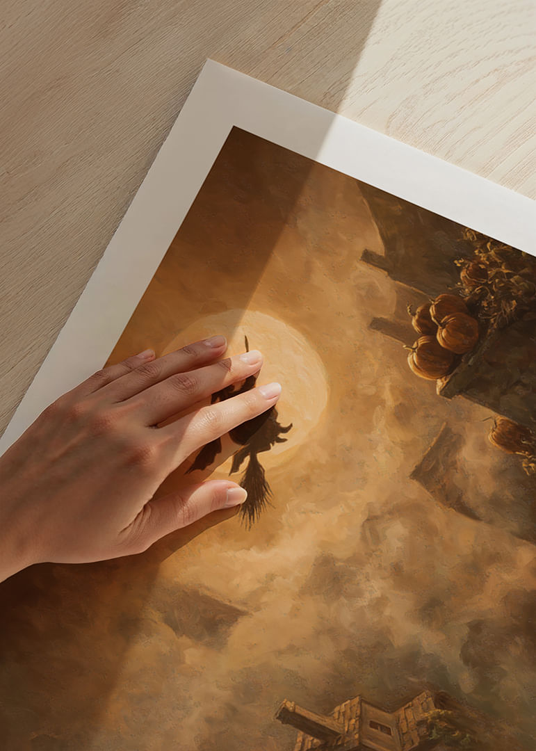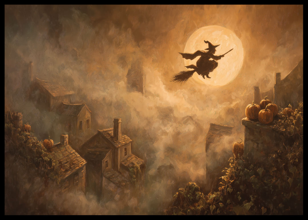 This poster captures an enchanting night with a witch hovering over a mist-covered village in the golden glow of a large full moon. The old houses, surrounded by pumpkins, give a sense of mystery and adventure. The warm color palette and evocative fog enhance the magical atmosphere. The poster creates a fantastic atmosphere in any room, perfect for injecting a sense of fantasy and mystery.