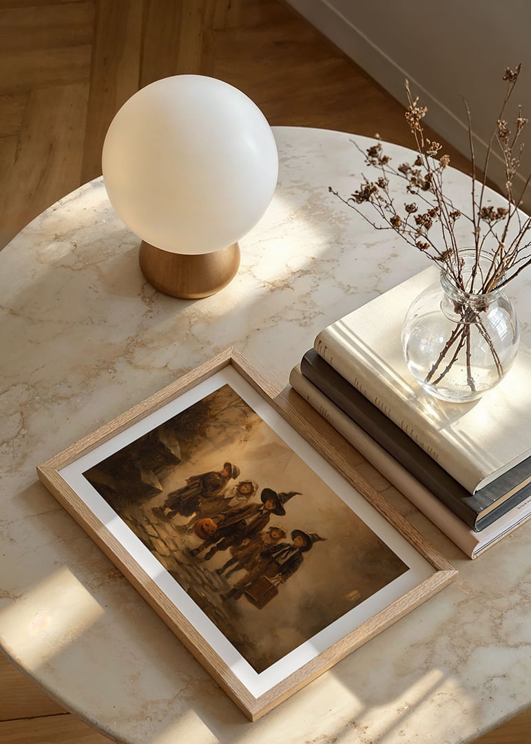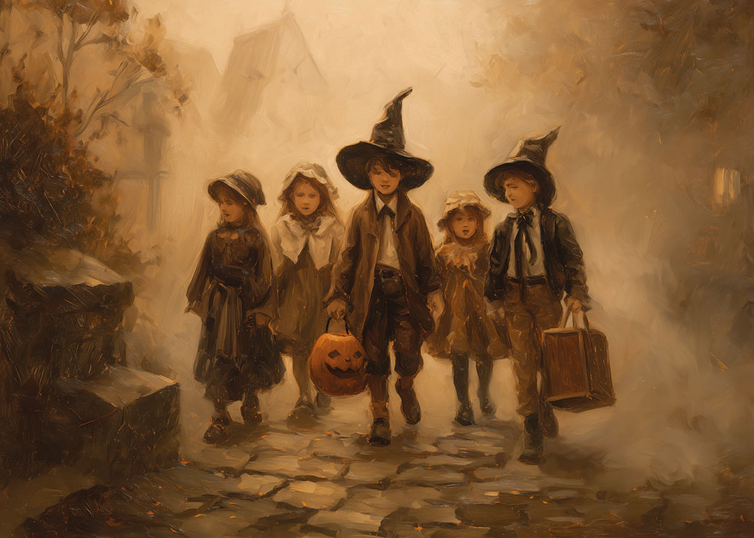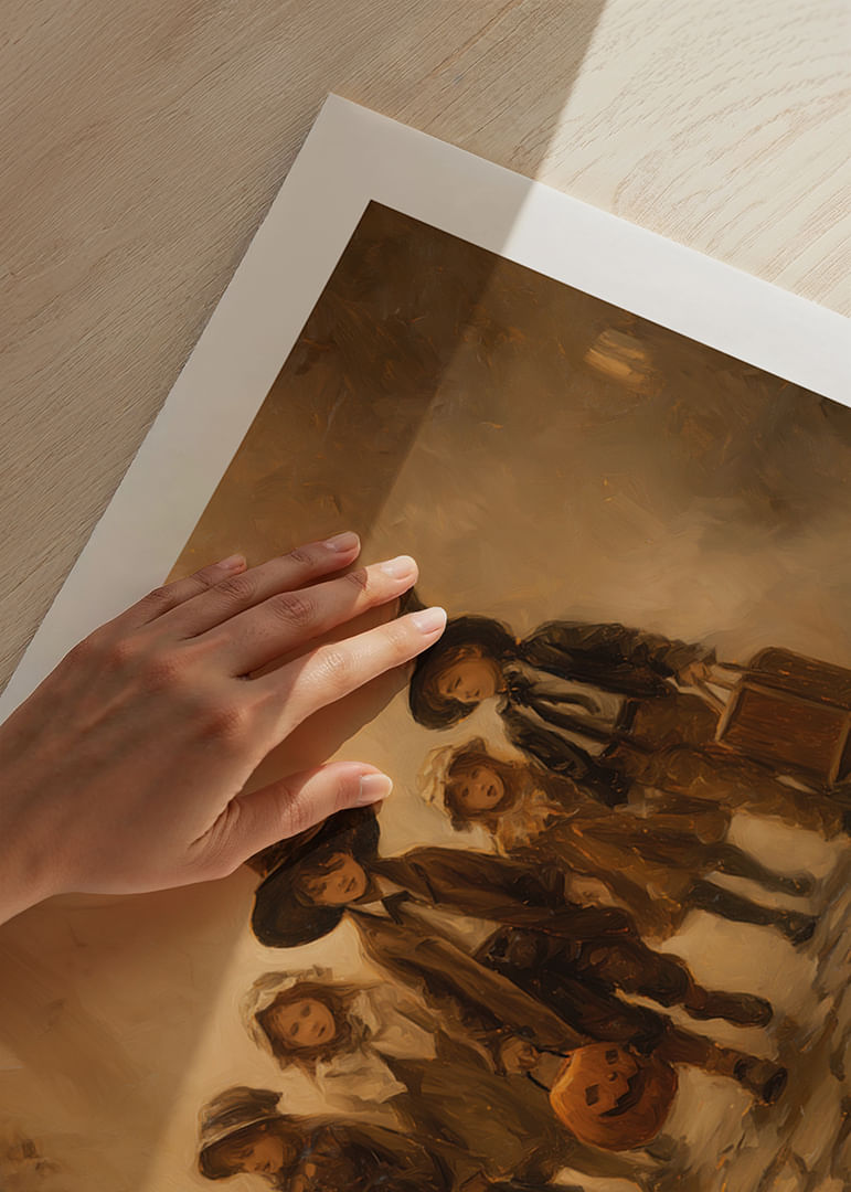 This poster captures a magical autumn feeling where four children, dressed in charming Halloween costumes, wander through a mist-covered forest path. They carry a glowing pumpkin and old suitcases, creating a timeless atmosphere. The dim, golden light creates a warm and inviting atmosphere. A perfect poster to give your room a nostalgic and mysterious feel that will take you back to the imaginative world of childhood.