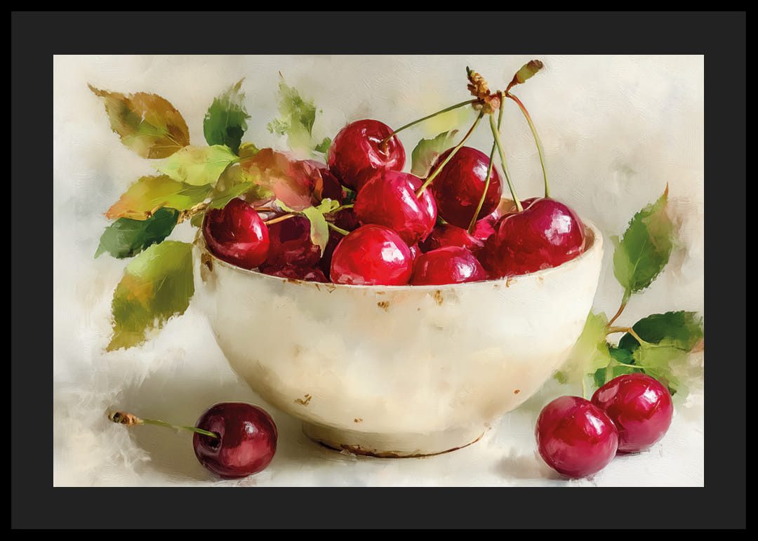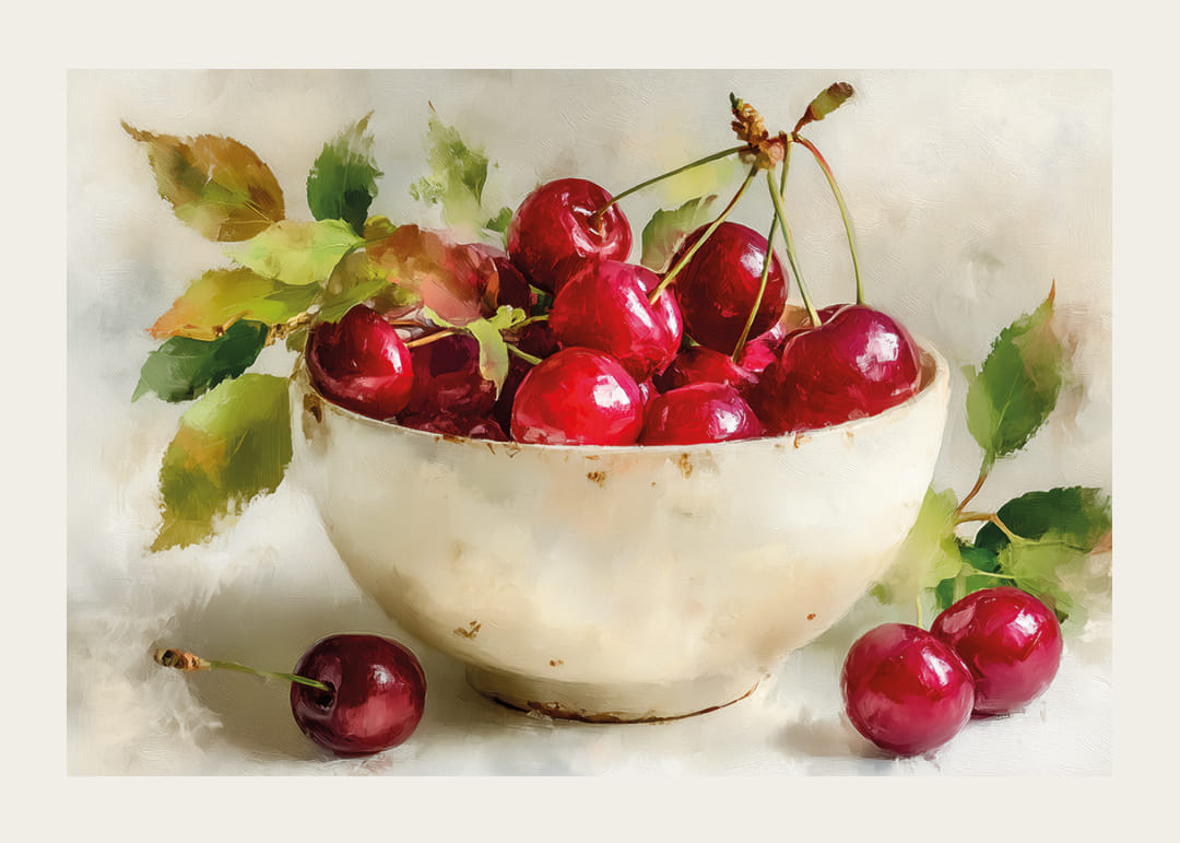 A bowl filled with bright red cherries creates a visual symphony of color and nature. This poster captures the light and nuances of juicy fruits, bringing life to any room. The green tones of the leaves and the deep red colors of the cherries create a harmonious balance. With this poster, your wall can be enriched with a sense of natural beauty and freshness that will soothe the mind daily.