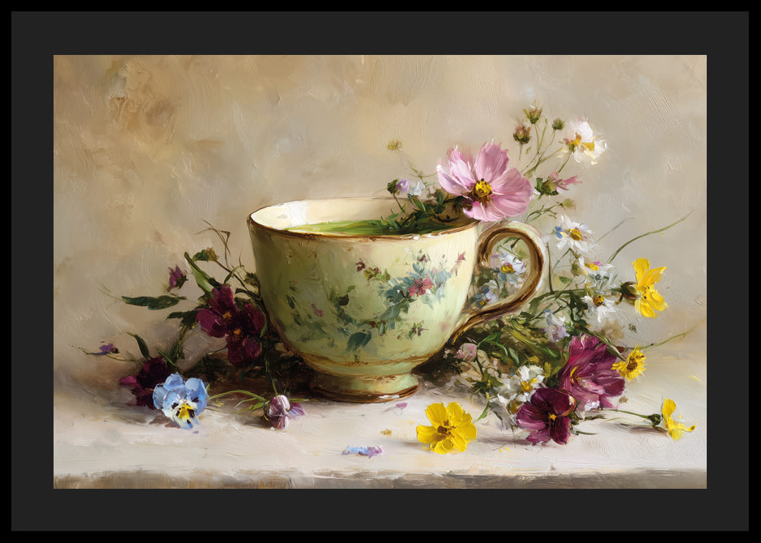 This inspiring motif evokes a sense of timeless elegance. The gentle tonal palette of the cup, surrounded by exquisite flowers, creates a stylish harmony. The flowers in full bloom frame the motif with vibrant color and delicate beauty. Perfect for enhancing the atmosphere of the home, this motif invites a sense of calm and charm to any room it adorns.