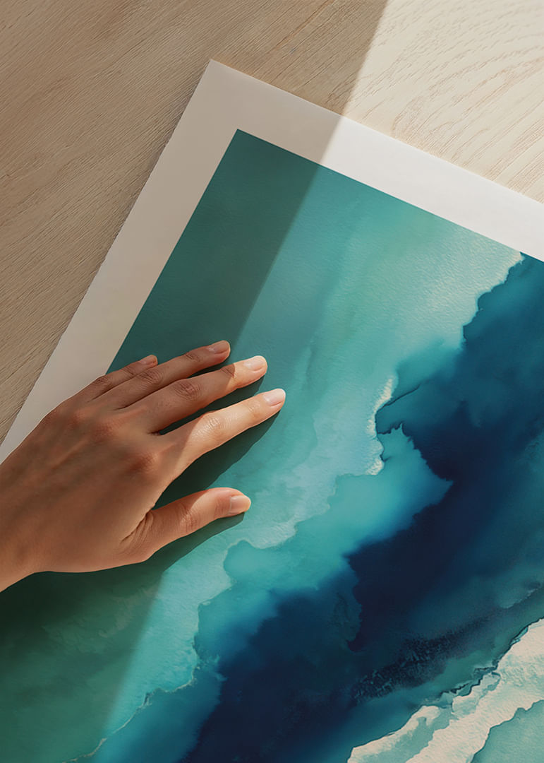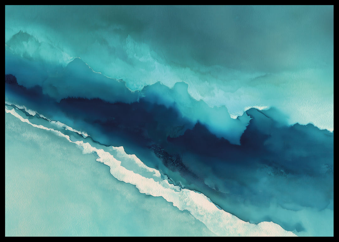 This poster captures a dreamlike world where turquoise and deep blue tones merge into a hypnotic ocean motif. The shifts in color create a calming feeling, reminiscent of the magic of the coast and the mystery of the sea. The poster becomes a focal point in the room, where it infuses the atmosphere with a sense of calm and overview. A perfect addition that enhances the dimensions of the interior.