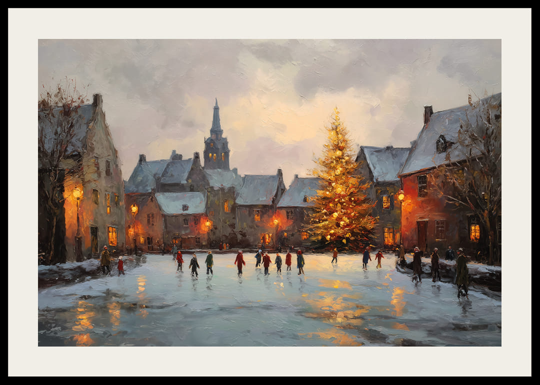 Feel the enchanting atmosphere of this poster that captures a magical evening in a picturesque village. Soft snowflakes fall as children and adults enjoy ice skating on the frozen pond, surrounded by warm Christmas lights from the Christmas tree and surrounding houses. This poster, with its soft colors and warm lights, invites a sense of community and spreads coziness in your living room.