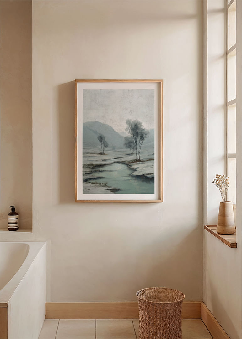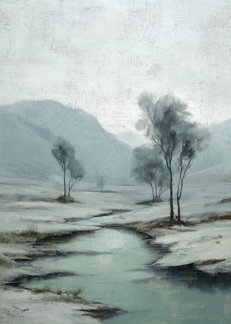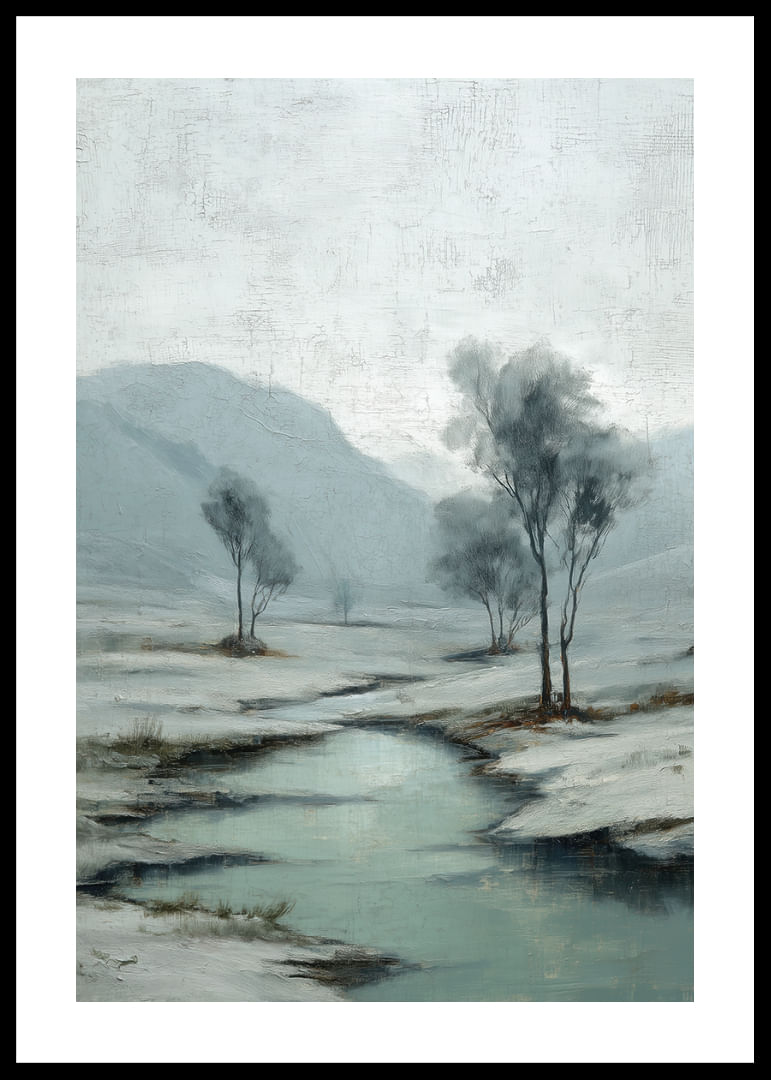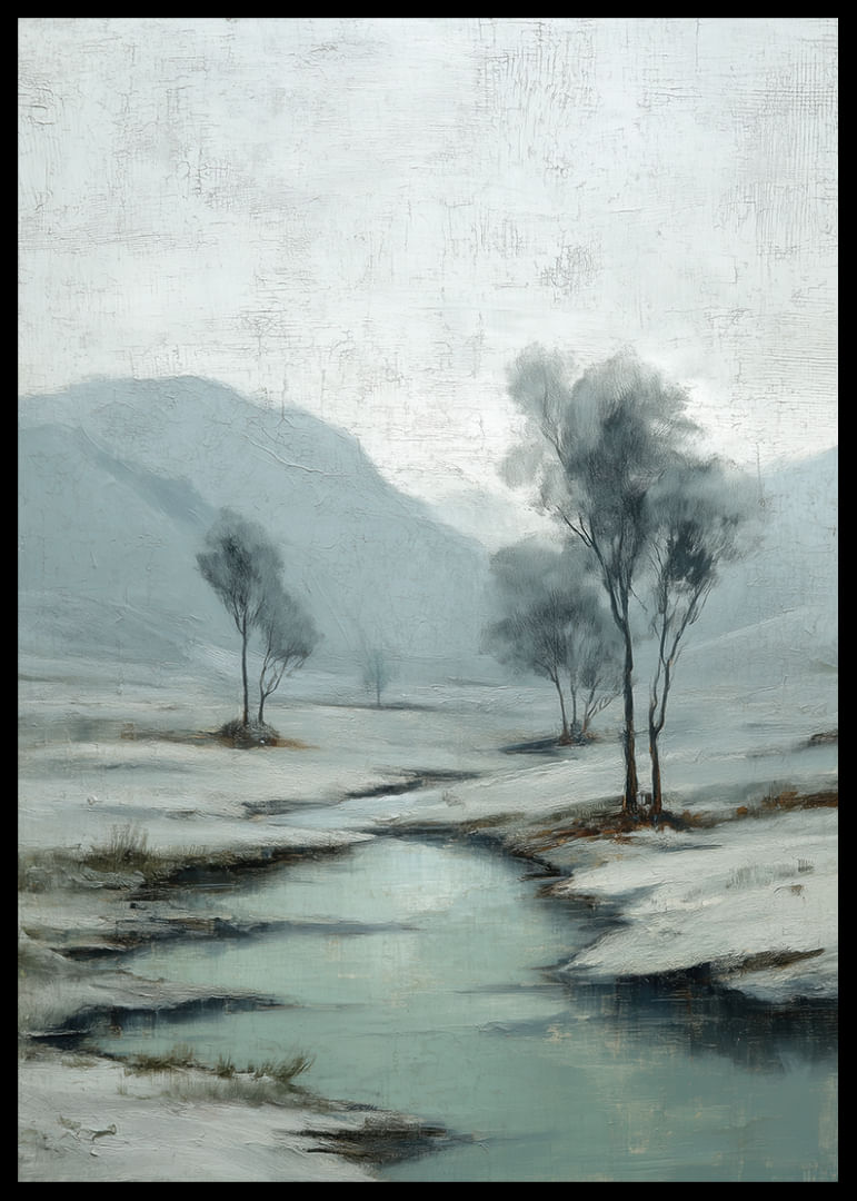 A wintry poster captures the attention with its tranquil snowy landscape where a crystal clear river meanders. The soft, icy colors and the still trees create a feeling of deep peace and timelessness. The contrast between the clear sky and the muted tones enhances the calming atmosphere of the motif. This poster transforms any room into a haven of peace and harmony.