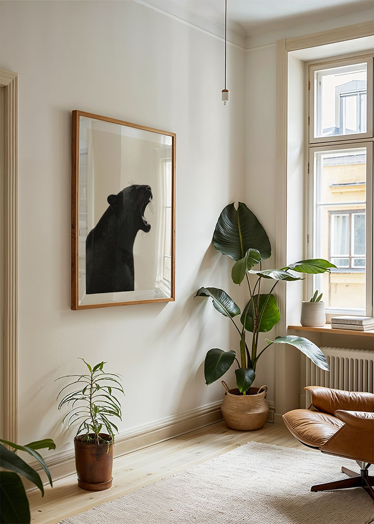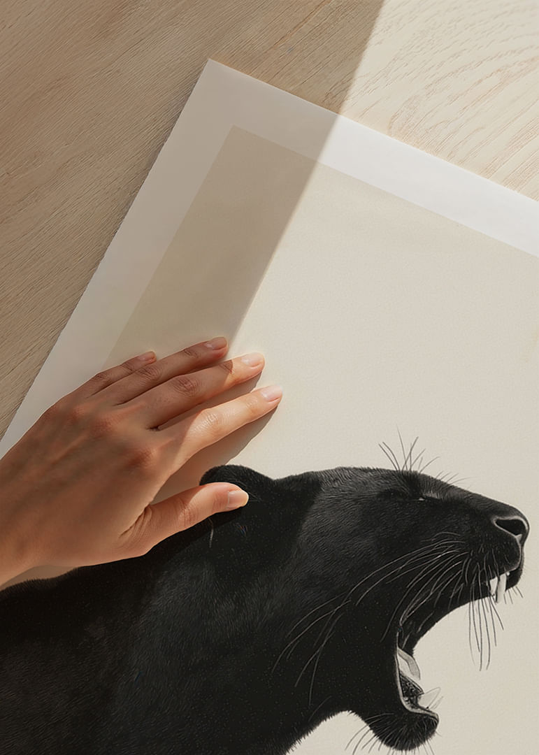 A powerful poster that captures a black panther in a moment of uncontrolled energy. With its mouth wide open and teeth bared, it exudes an impressive combination of strength and elegance. The light background contrasts beautifully with the panther's dark silhouette, giving the room a sense of mystery and drama. This poster will be an eye-catching centerpiece that will enhance the atmosphere of any room.