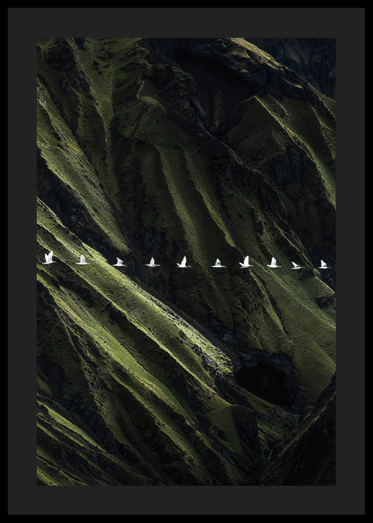 With this poster, you will be enchanted by white birds soaring elegantly over lush, green mountain slopes. The powerful contrast between the radiant birds and the deep greenery creates a sense of magic and freedom. The poster perfectly captures the essence of nature and adds a sense of tranquility and beauty to your home, transforming any room with its harmonious elegance.