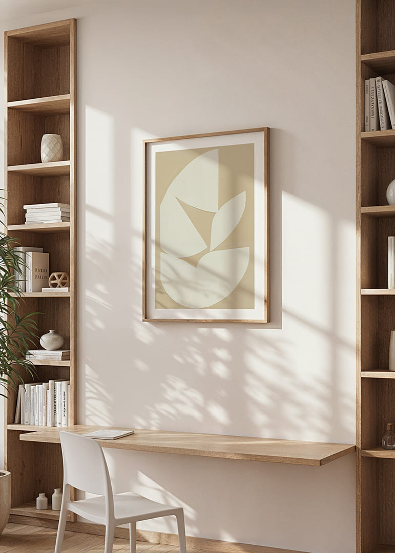 This poster catches the eye with its clean lines and soft shapes that seem to dance across the muted background. The colors are subdued and give a calming impression, making it a perfect addition to a modern home. The poster exudes a sense of harmonious balance and subtle beauty that is both inspiring and calming, creating a sophisticated atmosphere in any room