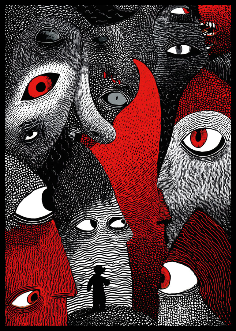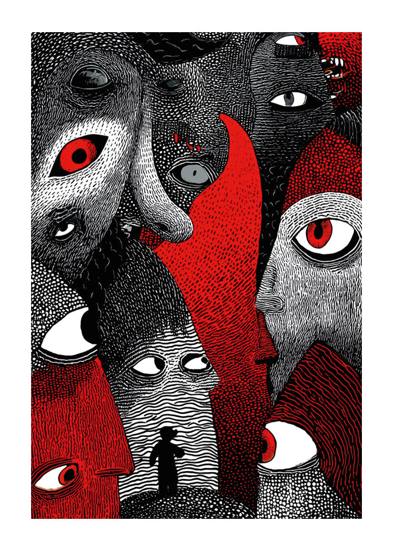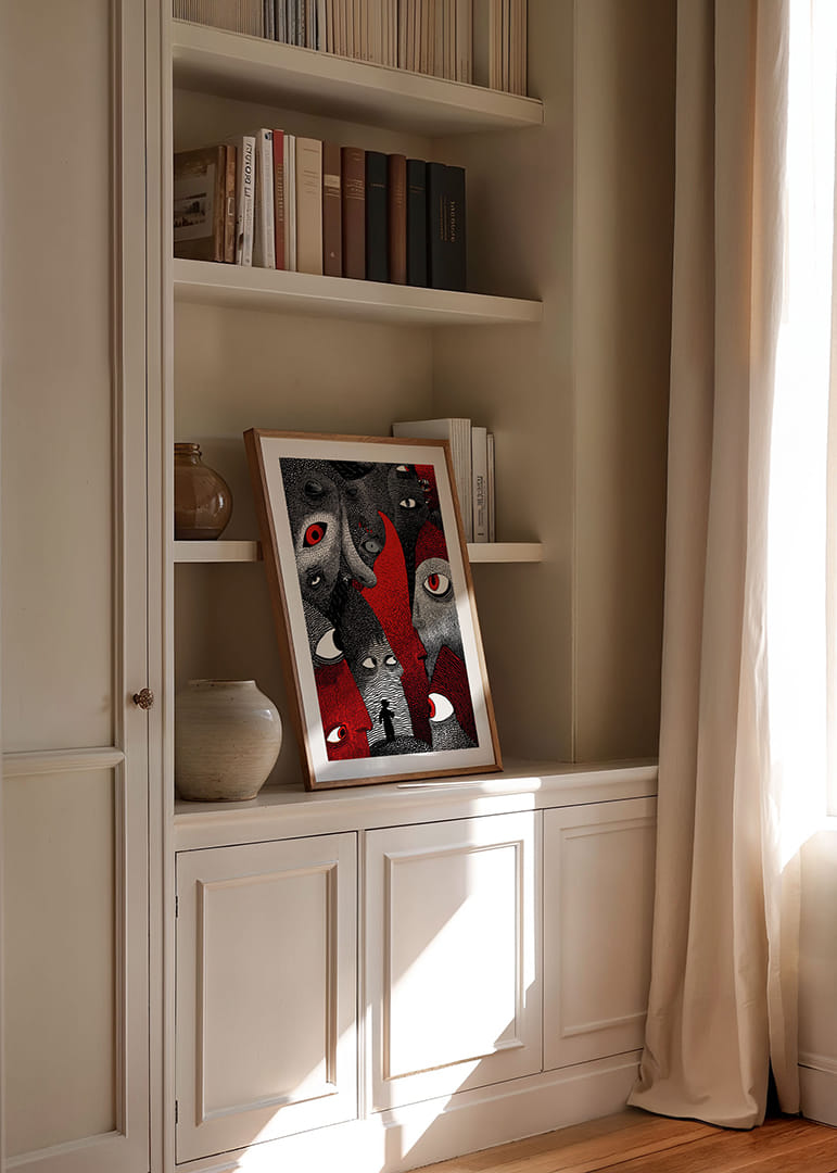 This fascinating poster catches the eye with its intense red and black patterns that almost seem alive. The bizarre faces and their large eyes create a sense of mystery and intrigue. This poster, with its intense expression, brings a room to life and arouses curiosity and emotions. Excellent for giving your space a unique, artistic atmosphere, full of depth and storytelling