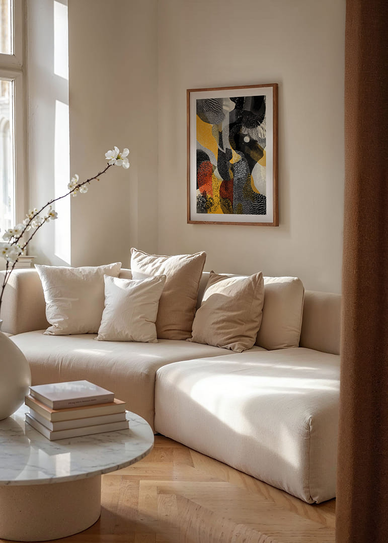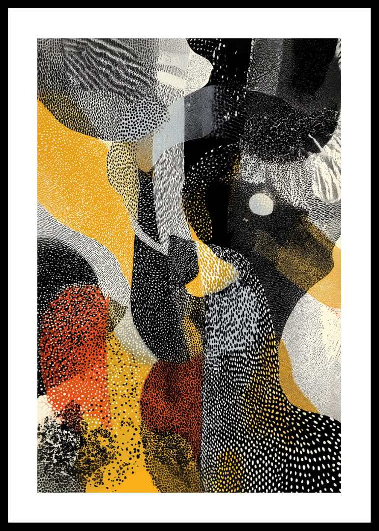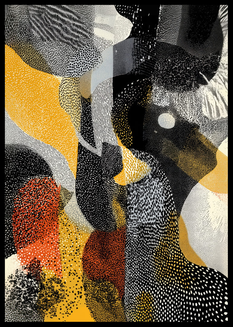 This poster catches the eye with its vibrant patterns and colorful textures. The contrasting colors of black, yellow and orange create a rhythmic movement that brings to mind cosmic landscapes. Interconnected shapes give a sense of infinity and depth. With this poster on the wall, any room will be transformed into a dynamic and inspiring space, filled with life and creativity