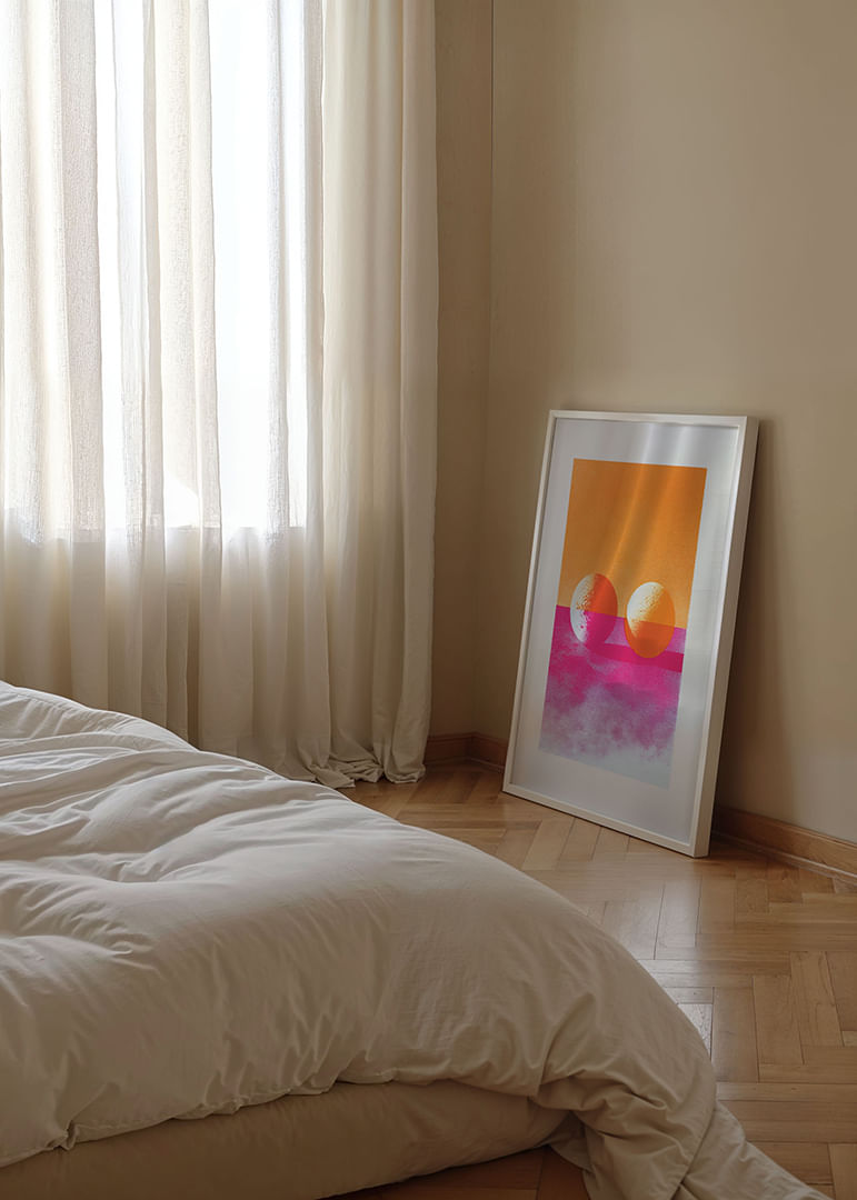 This poster catches the eye with its unique combination of colors and shapes. Two spheres float peacefully in the center, surrounded by a vibrant neon sky that transitions into soft, dreamlike clouds. It's a harmonious image of balance and reflection that brings to mind both fantasy and reality. Perfect for adding an exotic and modern feel to any room, this poster will be a conversation piece