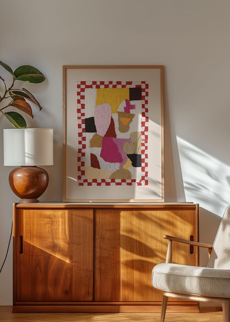 This poster captures attention with its colorful composition of various abstract shapes and patterns. Each color field is textured and vibrant, creating a sense of dynamic movement and harmony. The warm border frames the artwork and adds a playful touch. This poster will liven up any room with its unique blend of color and shape, bringing an artistic atmosphere to your home