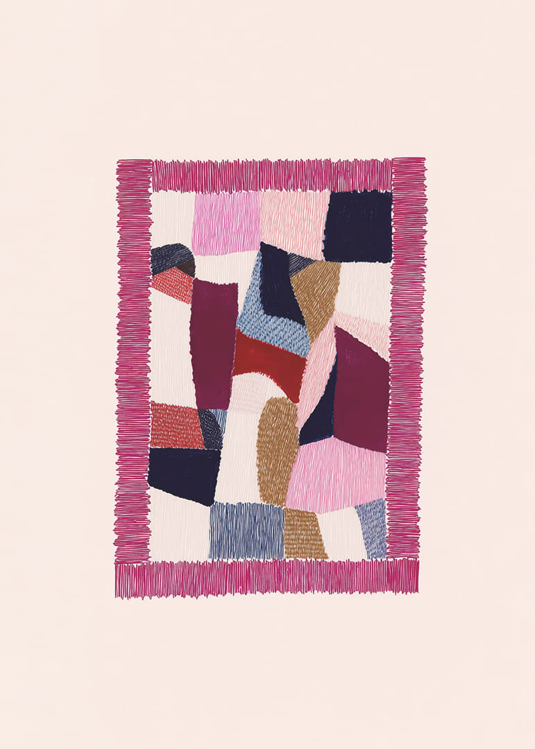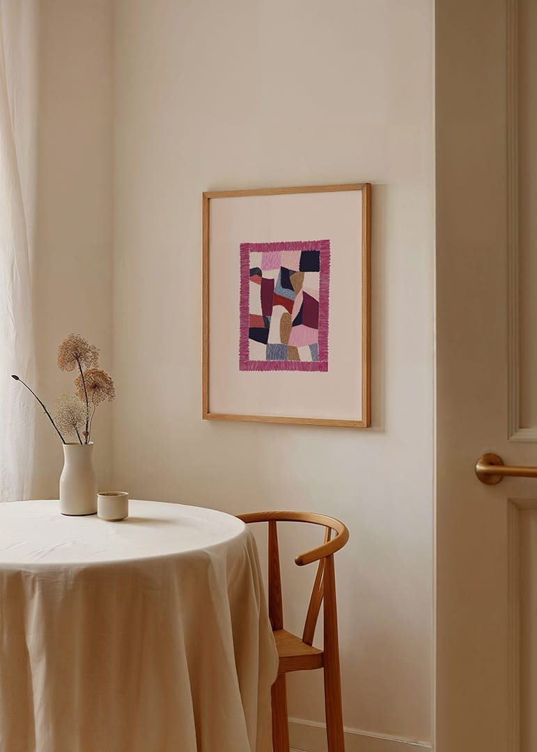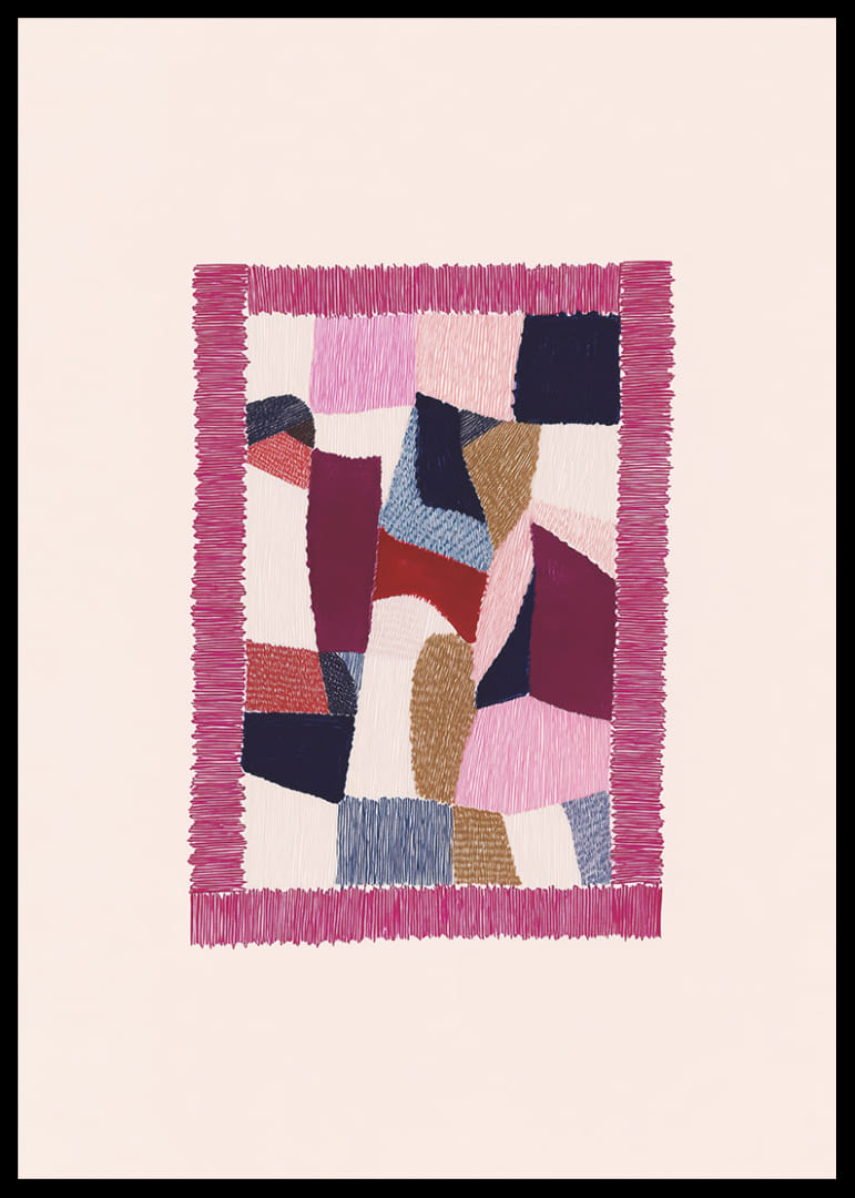 This poster catches the eye with its colorful geometric shapes that form a harmonious pattern. Its vibrant pink, blue and beige shades create a dynamic and energetic atmosphere. The intricate design of the poster gives the room a sense of modern elegance and creativity. It adds a unique charm and style to any home, making it a perfect addition to your interior design