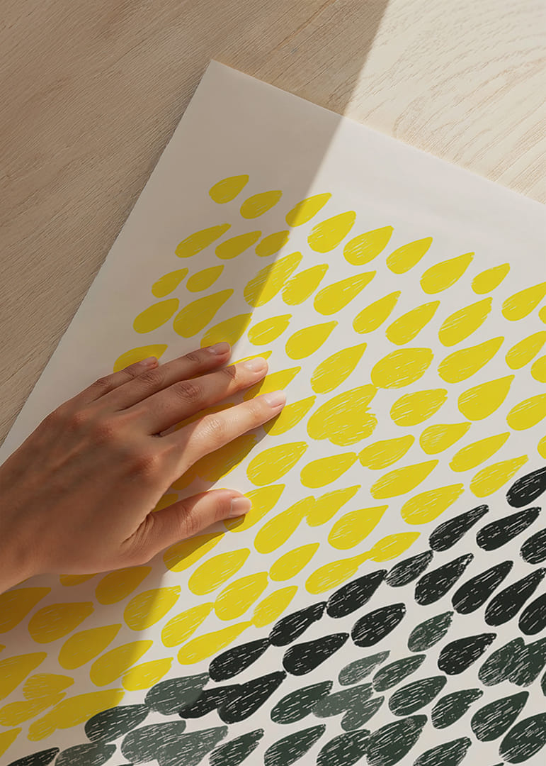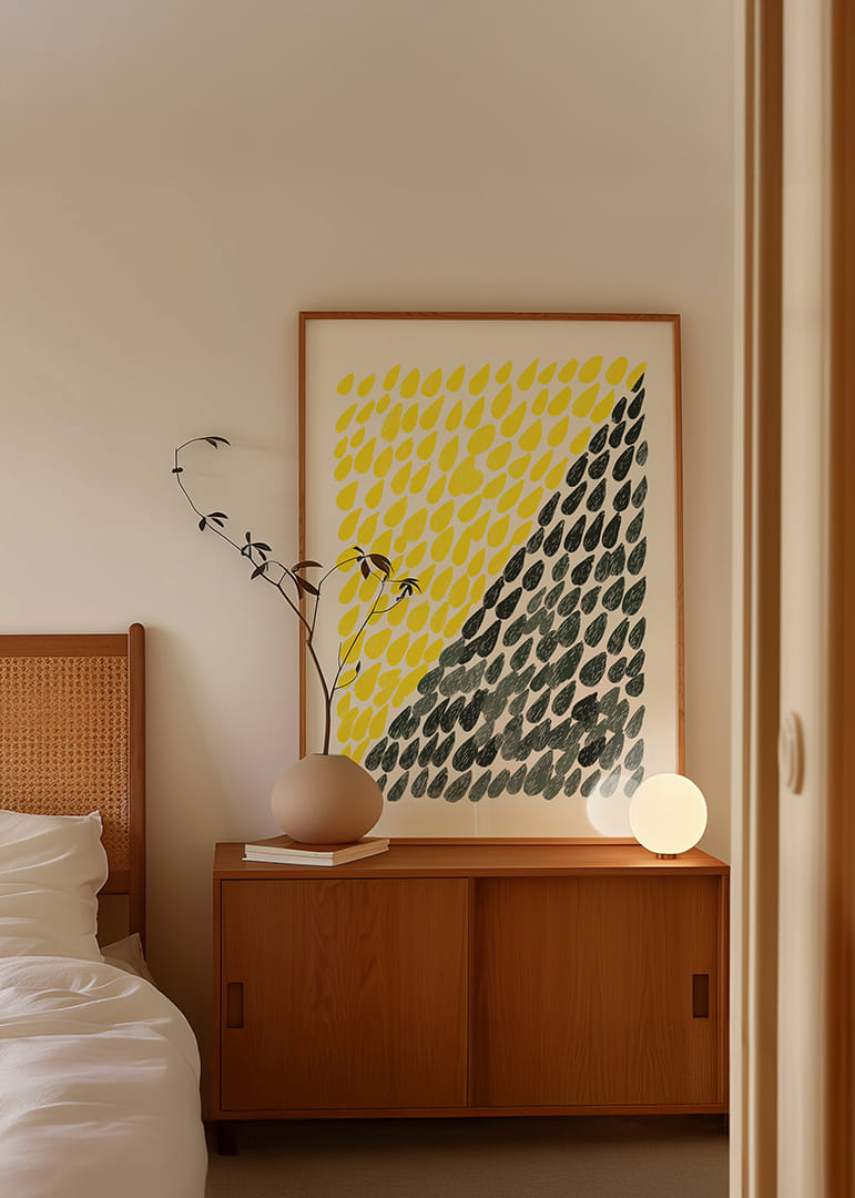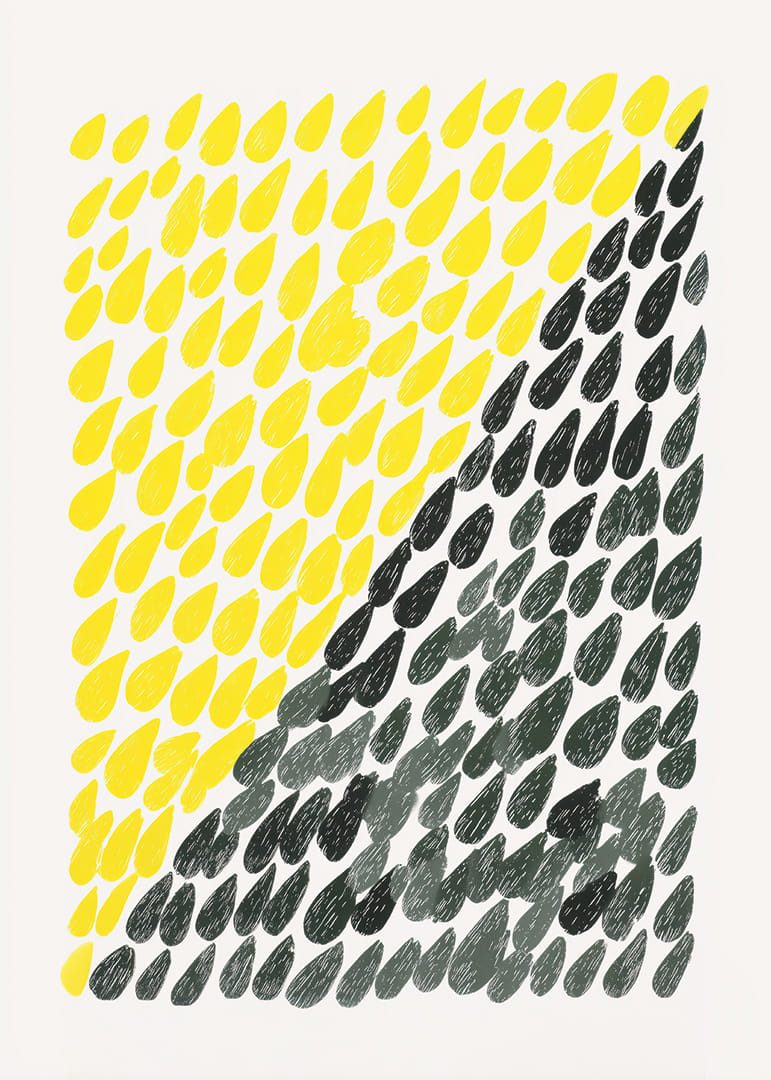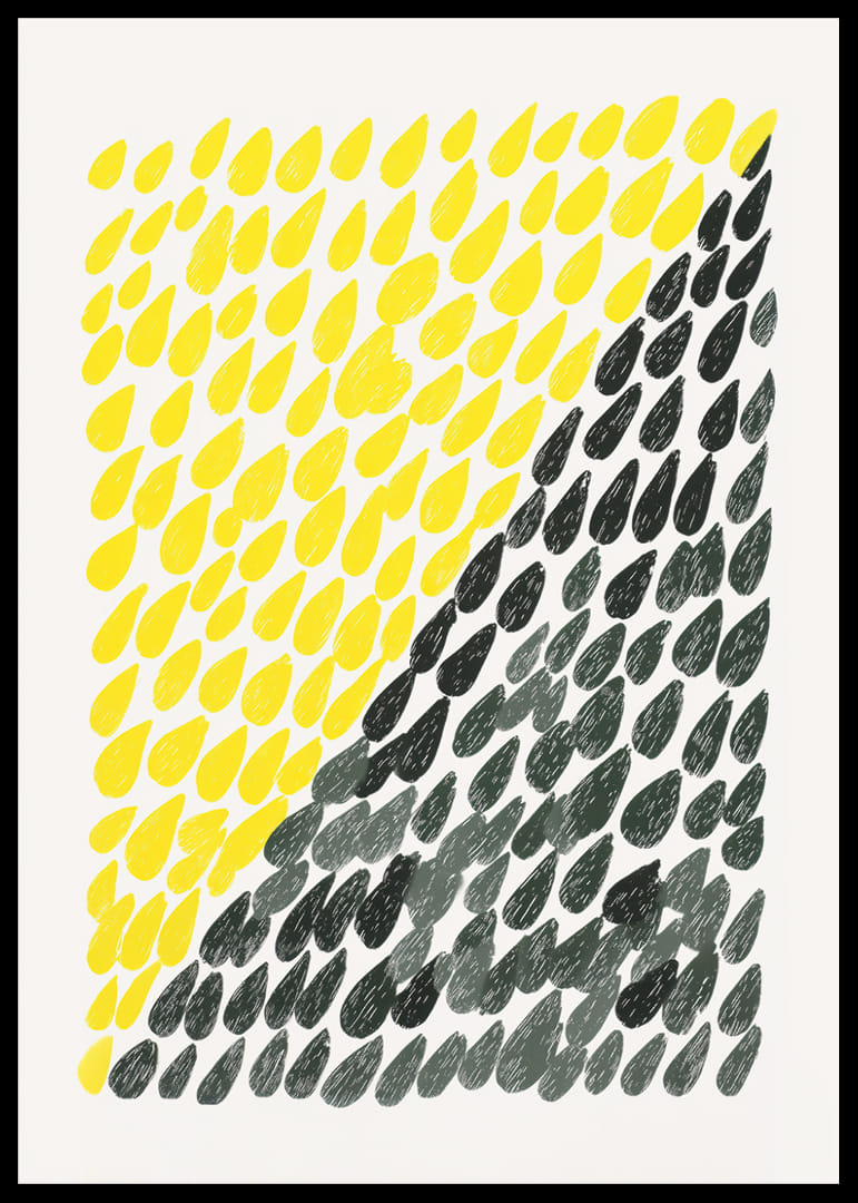 This poster catches the eye with its dynamic pattern of falling drops in light yellow and grey, creating a harmonious contrast. The vibrant colours and the rhythmic arrangement of the shapes give a fresh and energetic feel. The poster is perfect for giving your home a modern and exciting atmosphere, where every look reminds you of the changing moods and colours of nature