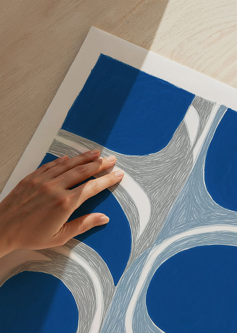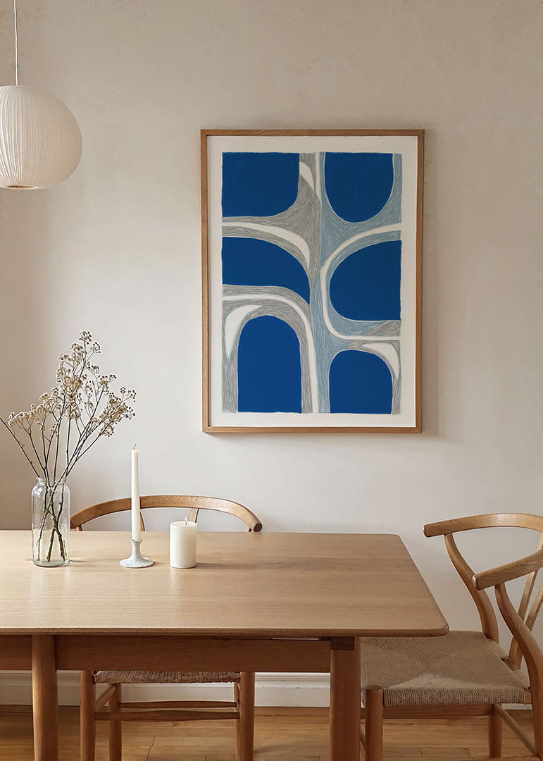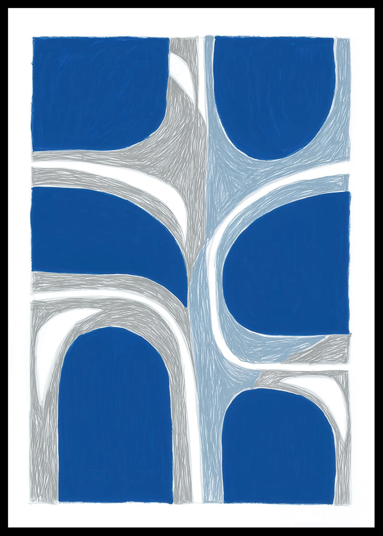 This poster catches the eye with its bold blue and grey tones that dance in stylized shapes. The modern design creates a sense of movement and balance, where every curve and line interacts in a visually fascinating unity. Perfect for elevating a room with its sophisticated aesthetic, this poster adds a sense of timeless elegance and tranquility to any environment