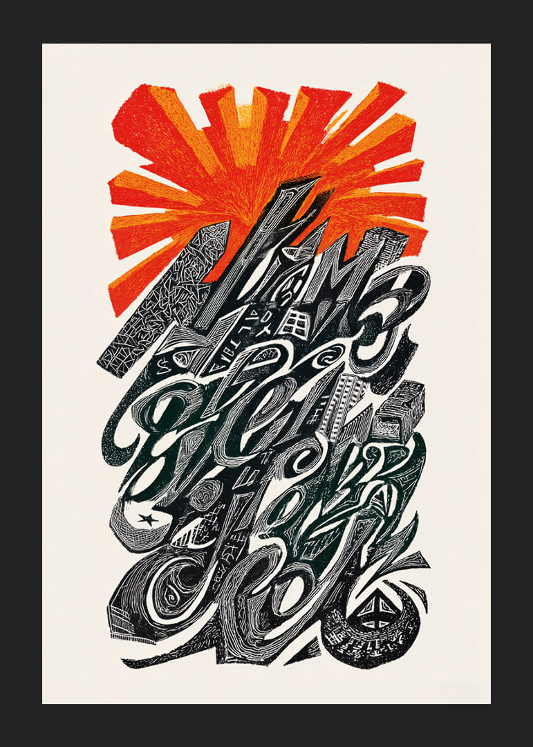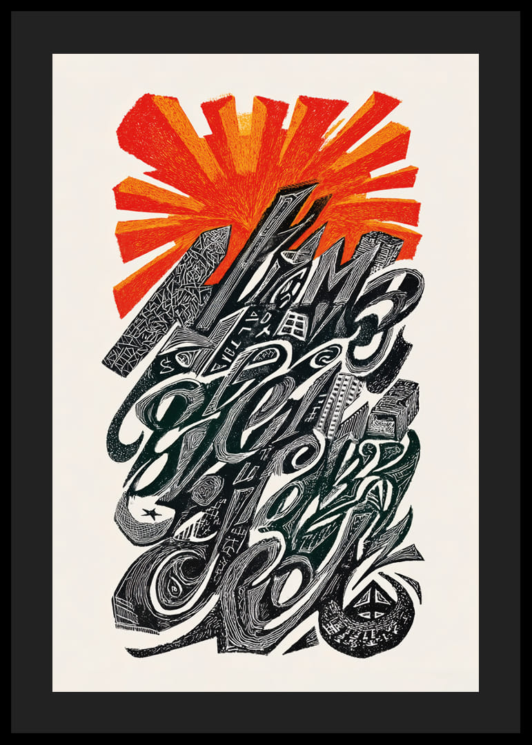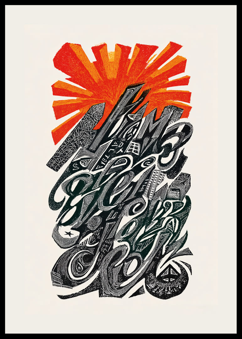 The poster catches the eye with a colorful city skyline rising against a dramatic sunrise. The contrast between the black, squiggly shapes and the bright orange creates a vibrant dynamic. This poster injects energy and urban tones into any room, transforming an ordinary wall into a vibrant artistic statement. Perfect for elevating a modern interior with creative flair