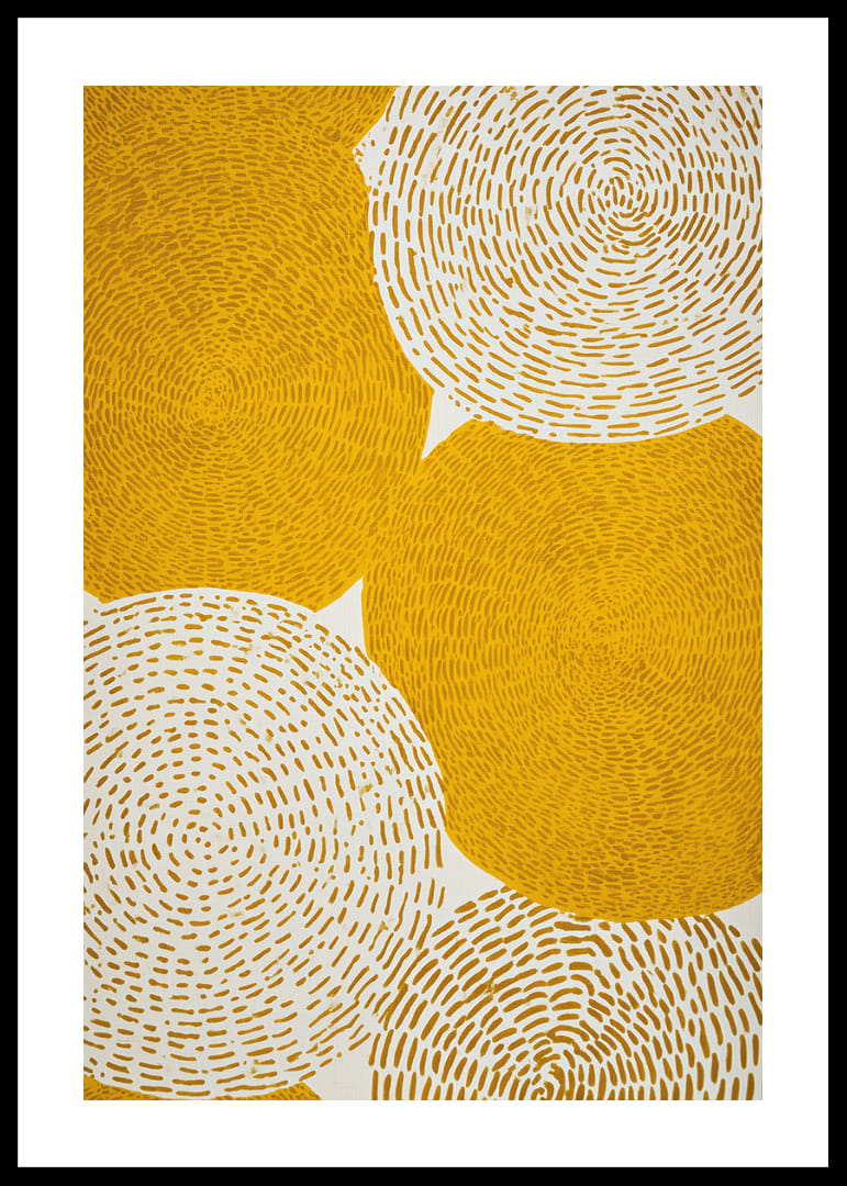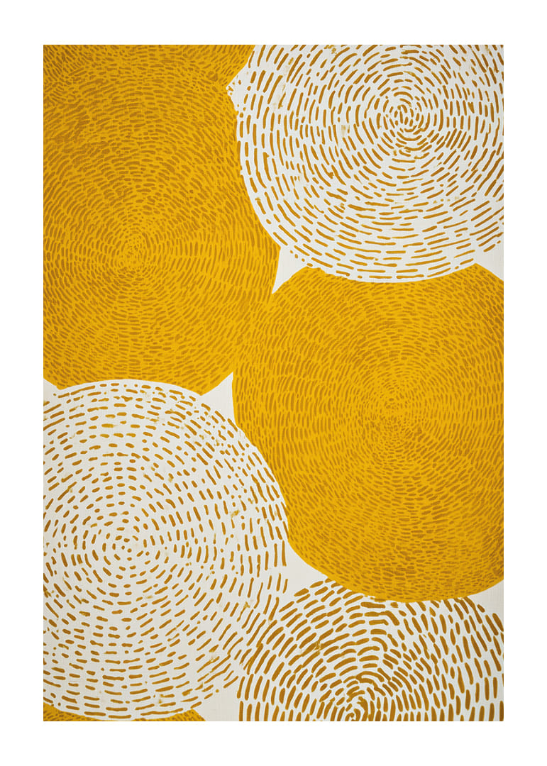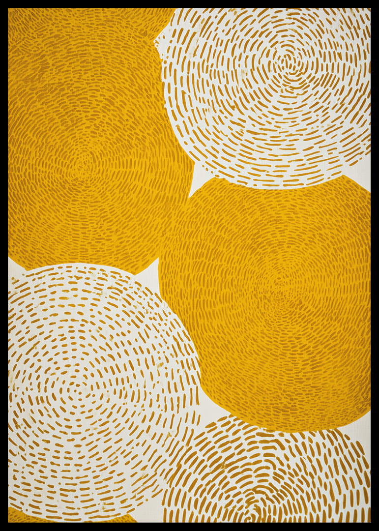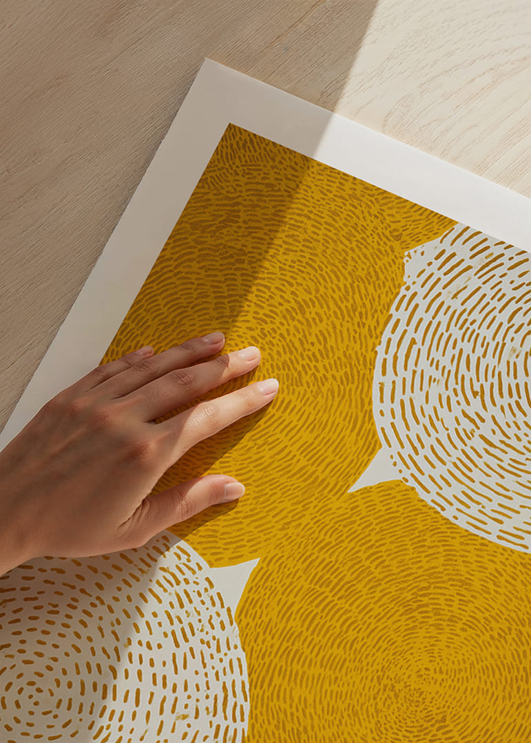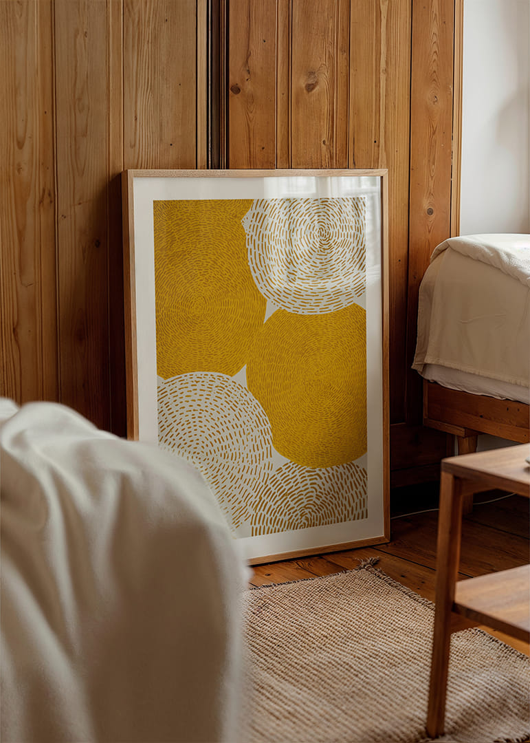 This poster catches the eye with its warm golden circles that overlap in a harmonious pattern. The sunny shades and organic shapes create a sense of calm and elegance in the room. The soft rhythm of circles and lines provides both dynamism and balance, making the poster a perfect interior detail that lifts any wall and creates a welcoming atmosphere