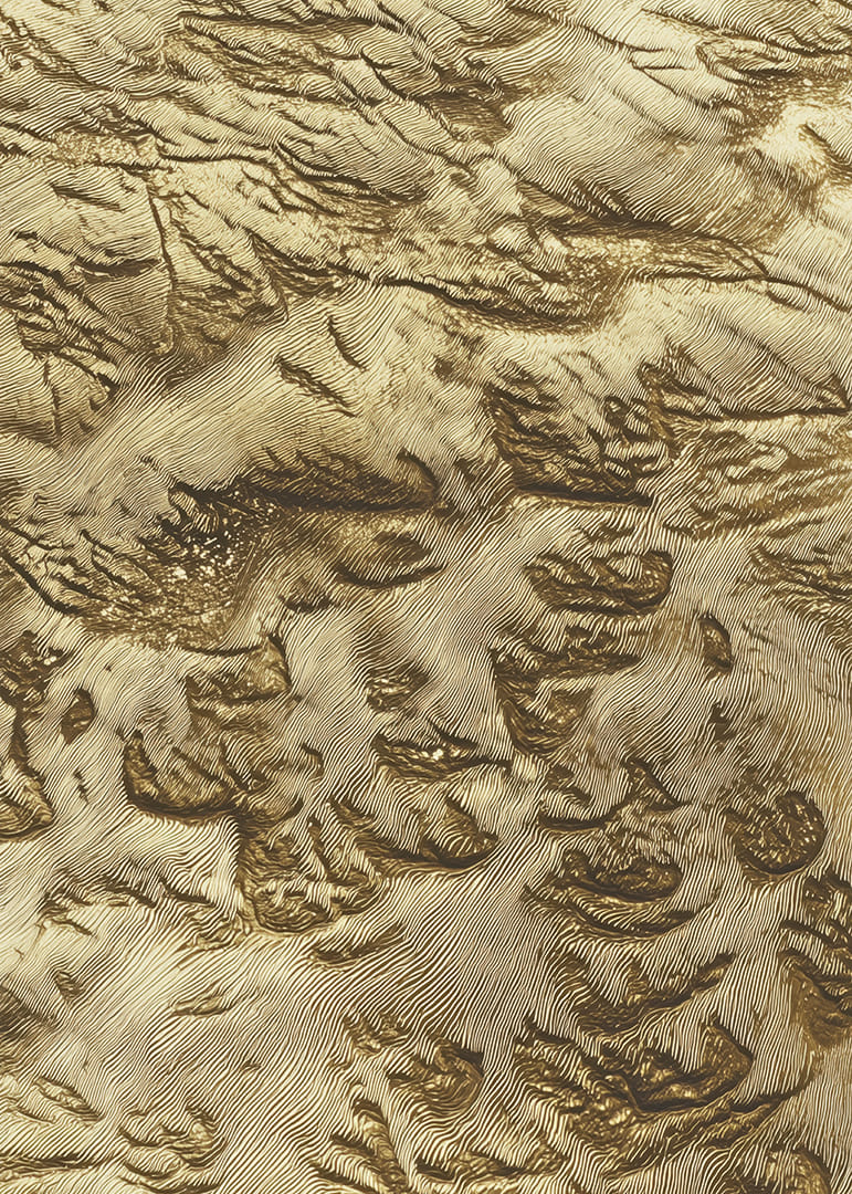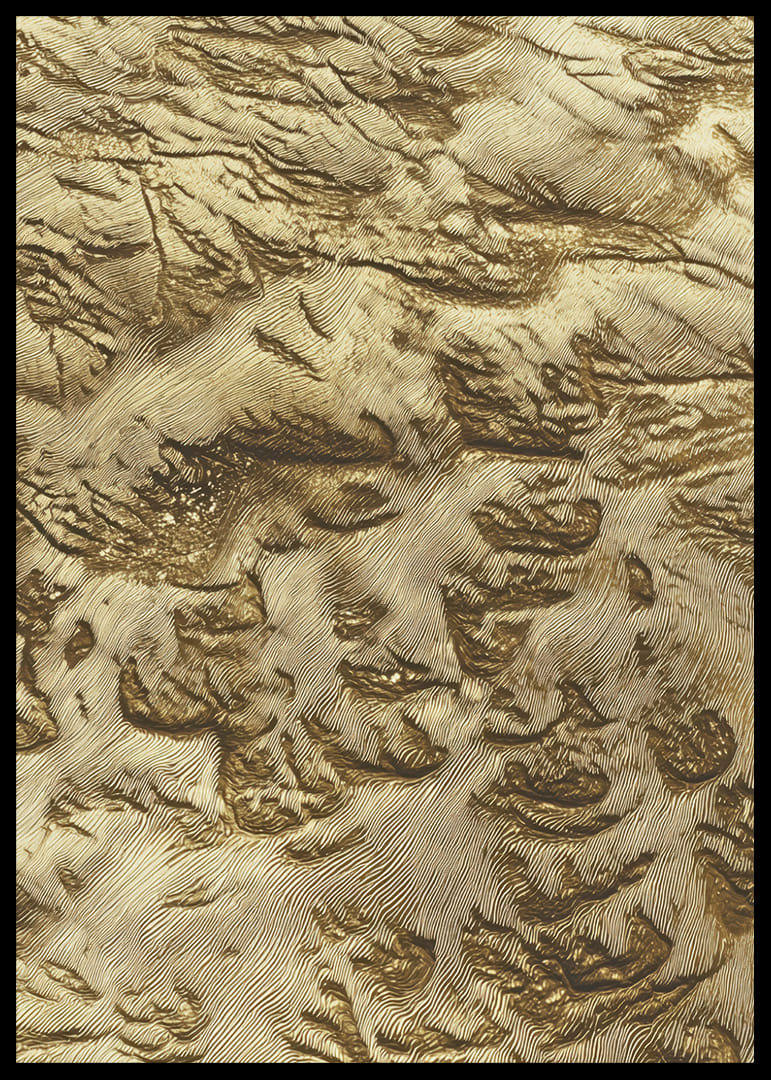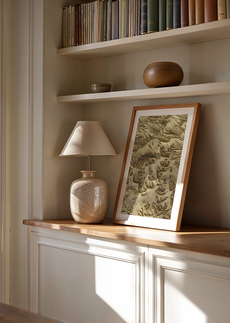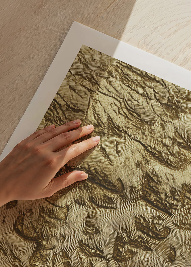 This poster catches your eye with its golden hues and intricate patterns that resemble a desert illuminated by a setting sun. The sweeping lines form a dreamy and fluid motif that enhances the feeling of unbroken movement and tranquility. The poster adds a sophisticated warmth to your room and becomes a focal point for reflection and inspiration in your home