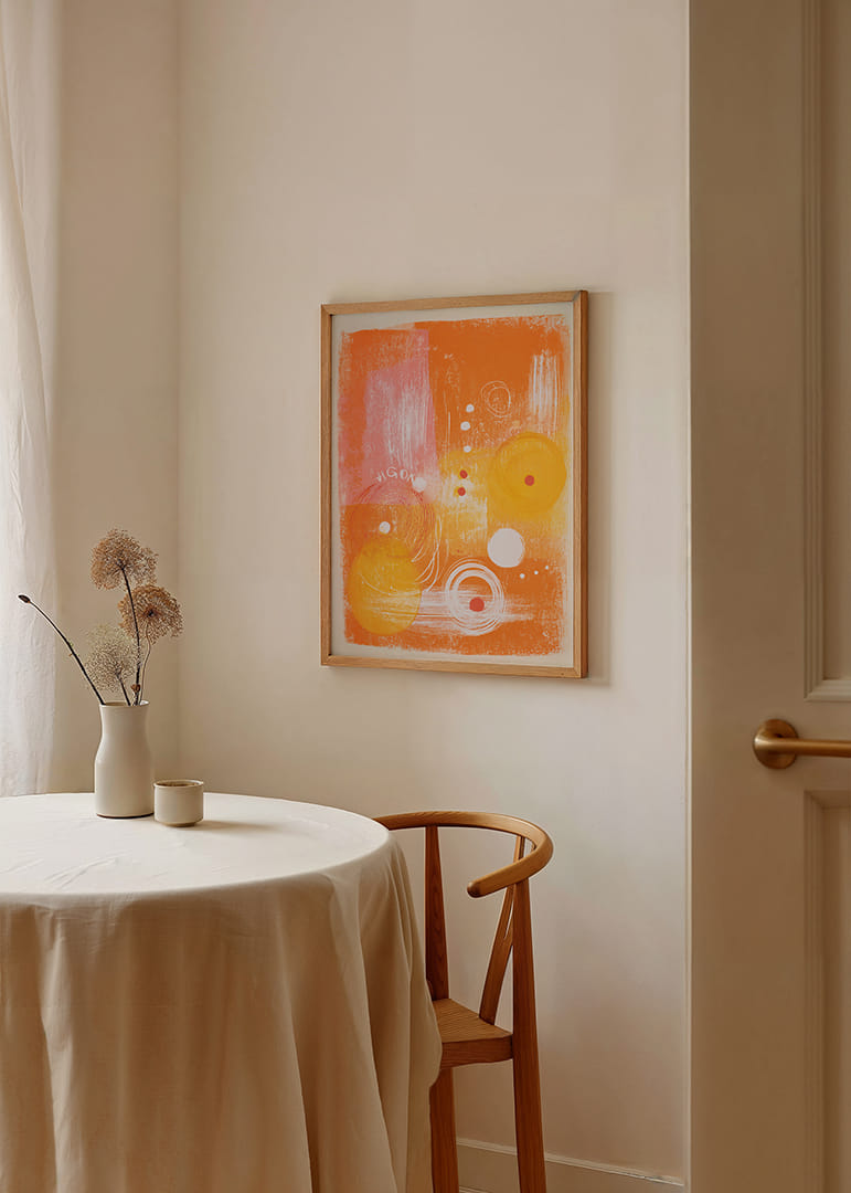 This abstract poster immediately catches the eye with its warm, sunny colors. The swirling pattern of the color explosion creates a sense of energy and movement that brightens up any room. The contrast between vibrant brushstrokes and subtle shades adds depth and dimension. The poster's vibrancy and bright tones lift the mood and make it the perfect detail to transform your home