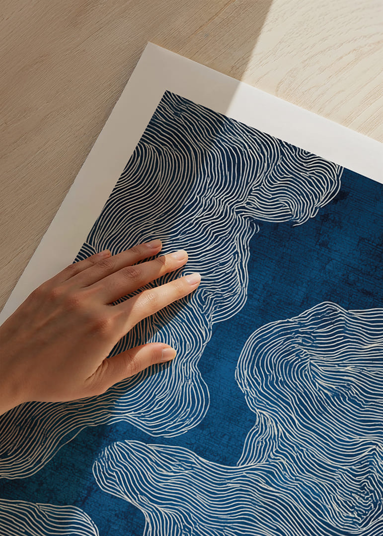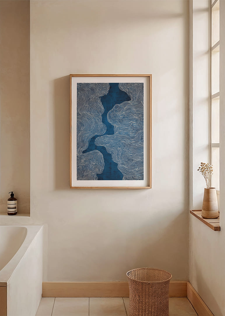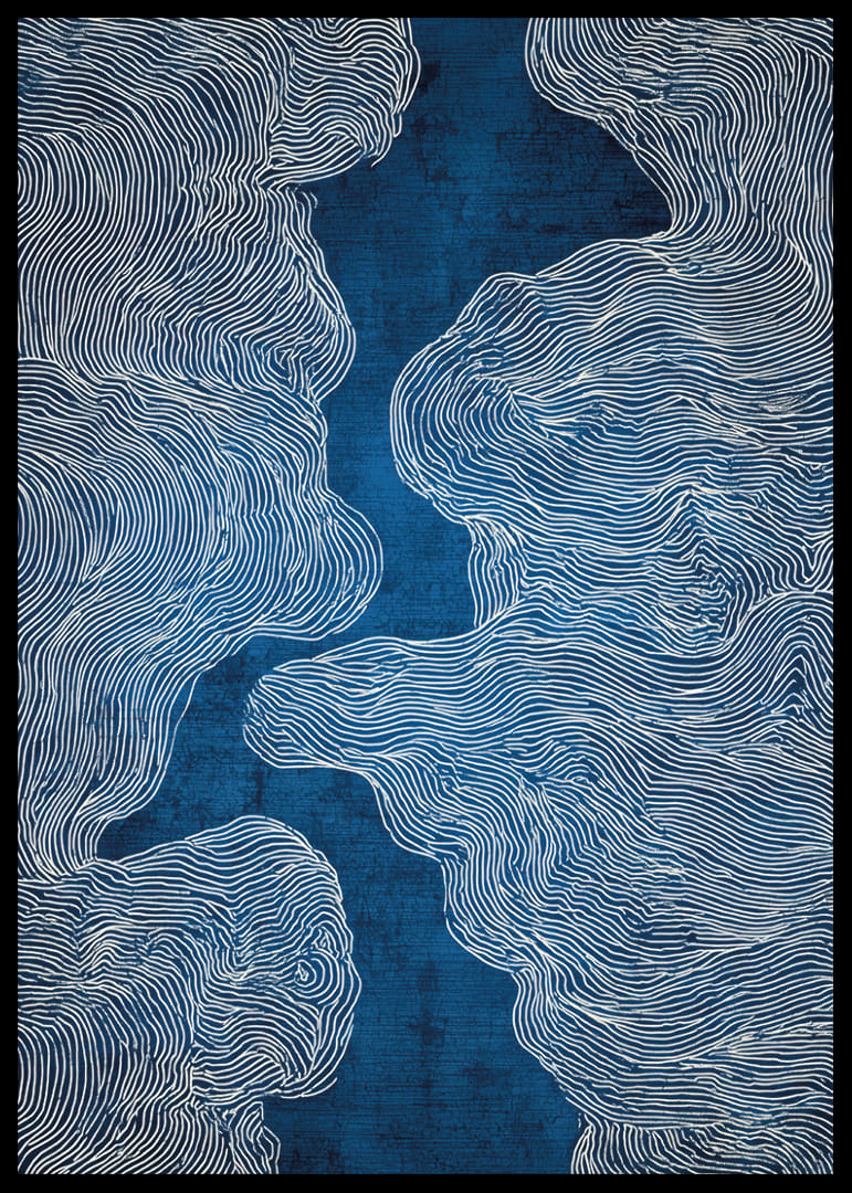 With its swirling blue currents and elegant contours, this poster transforms any room into a dreamy landscape. The soft lines that move through the motif create a sense of mystery and tranquility, enticing the viewer to explore every detail. This poster creates an atmosphere that inspires both reflection and creativity, and will quickly become a central conversation piece in any home