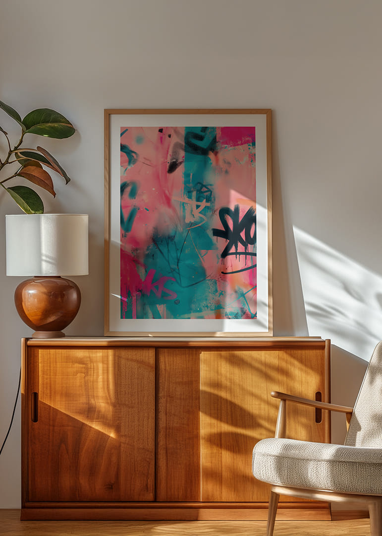 This poster immediately catches the eye with its dynamic colors and lively movements. The colors of neon pink and deep blue create an electric feeling, as if the urban graffiti culture has come to life on the wall. This poster brings a modern and expressive touch to your home, filled with energy and life, transforming any room into a place with a creative pulse