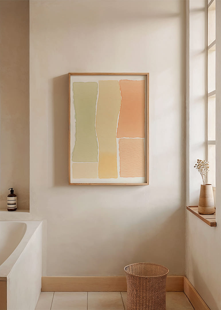 This poster conveys a sense of peace through its soft, earthy color tones. The delicate transitions between green and orange create a balanced and inviting feel, while the subtle textures add a dimension of depth and interest. The poster will be a perfect centerpiece in the living room, highlighting the calming atmosphere of the home with its natural tones and elegant composition