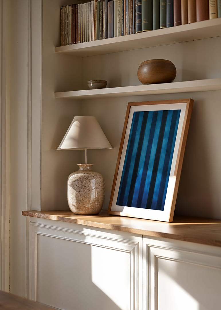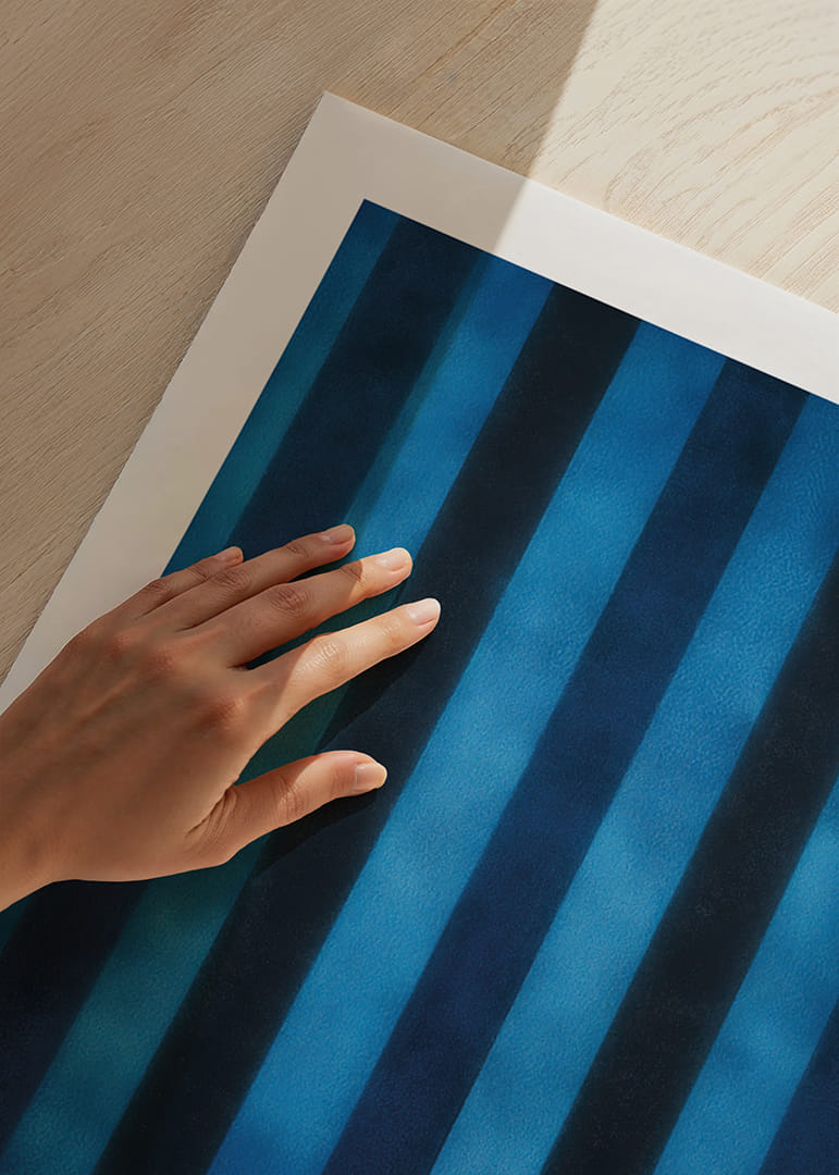 This poster catches the eye with its deep blue and black stripes, which form a hypnotic pattern. Each line interacts harmoniously and evokes a sense of mystery and depth. The composition of the colors gives a calm and meditative impression. By hanging this poster in a room, a harmonious and suggestive atmosphere is created that both captivates and calms the viewer's mind