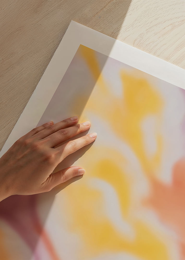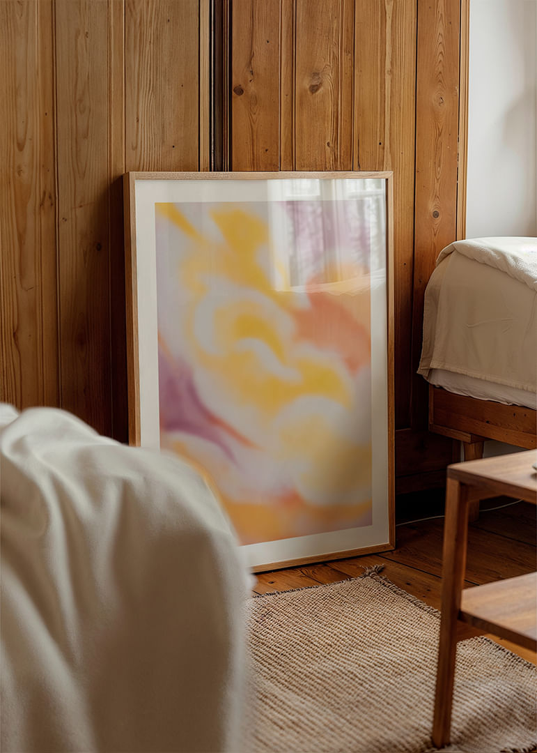 This poster captures a sense of tranquility with its soft pastel tones that flow together in a dreamlike pattern of orange, purple and yellow. The colors subtly blend into each other, creating a pleasant and harmonious atmosphere that invites reflection and relaxation. A perfect poster to brighten up any room and give the wall an artistic touch of calm and beauty