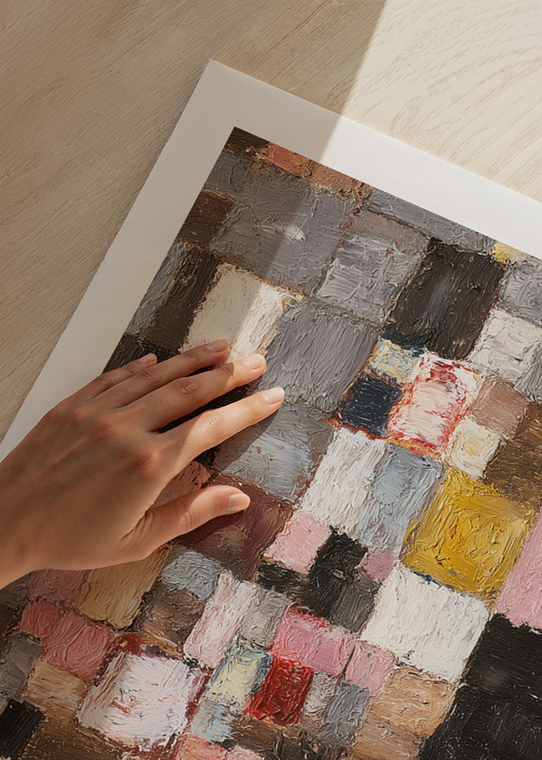 This poster catches the eye with its vibrant rectangles and deep textures, a mix of colors that create a dynamic and vibrant feel. Using a variety of tones from warm browns to soft pinks, the poster highlights an abstract landscape that is both calming and inspiring. This unique composition adds artistic depth to any room and transforms everyday life into a visual experience