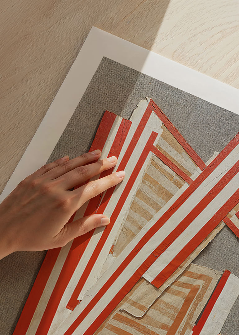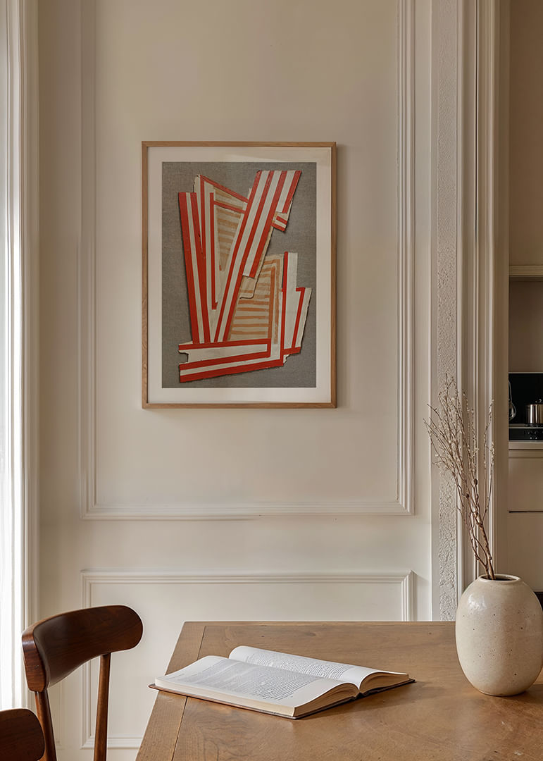 This poster catches the eye with its vibrant red and white lines dancing across a neutral background. The shape and colors create an energetic and dynamic rhythm that draws the viewer into an abstract universe. The combination of lines and contrasts arouses curiosity and enlivens any room. A poster that is guaranteed to create a modern and bold atmosphere in your home