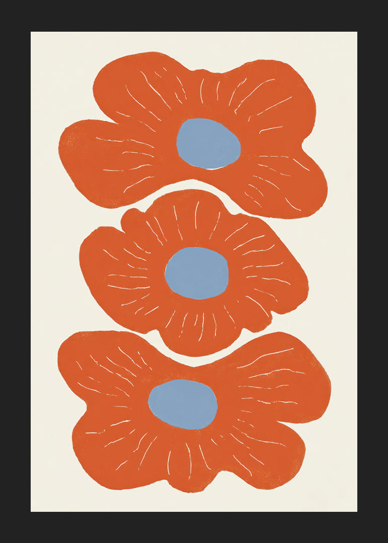 Featuring three large floral shapes against a bright background, this poster captures the essence of life and energy. The warm red and blue tones create a harmonious dance of colors that draws the eye. Each flower exudes a unique character, giving the room a sense of dynamism and vitality. This poster is a perfect decoration to add a modern and lively touch to your home.