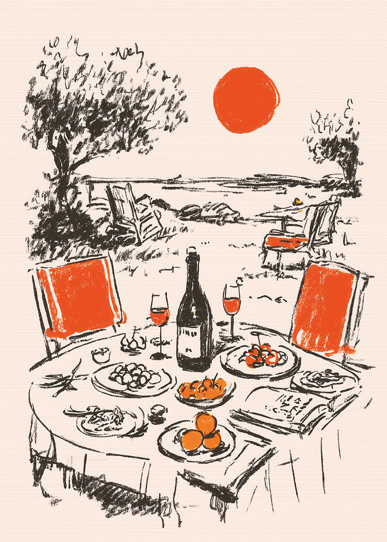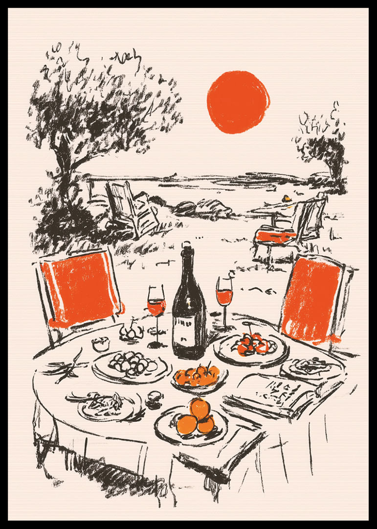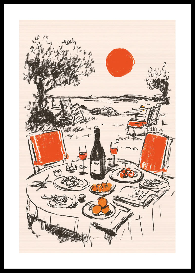 This poster captures the essence of an idyllic evening with a beautiful sunset over the sea in the background. A table set with delicate dishes and red wine sets the stage for an experience filled with flavor and harmony. Stylized chairs invite you to relax under the warm, golden light. This poster not only offers visual pleasure but also a sense of calm and charm in the living room.