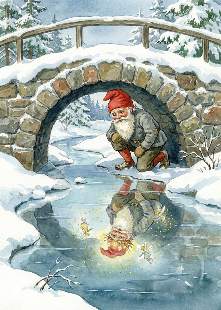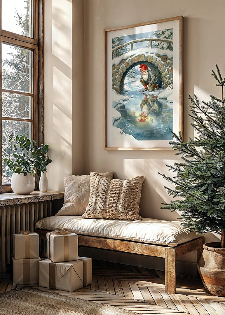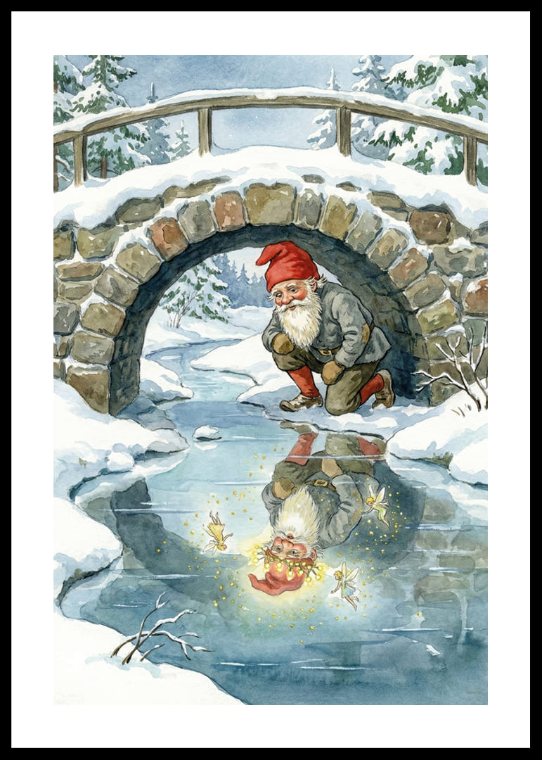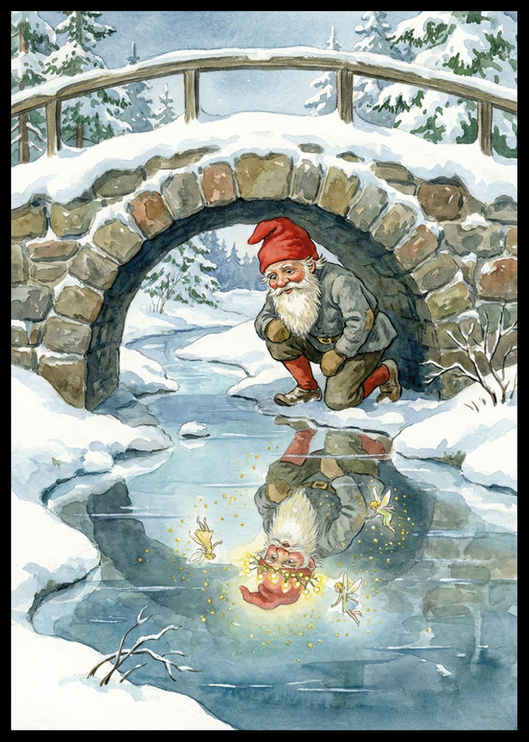 This poster captures a fairytale scene where an elf is fascinated by his sparkling reflection in a frozen stream. The surrounding snow-covered landscape and the sturdy stone bridge create a sense of nostalgic enchantment. The poster's soft colors and detailed illustrations bring an atmosphere of magic and tranquility to any room, perfect for creating a cozy and inspiring environment