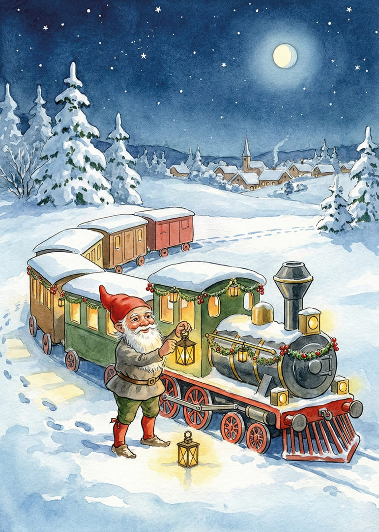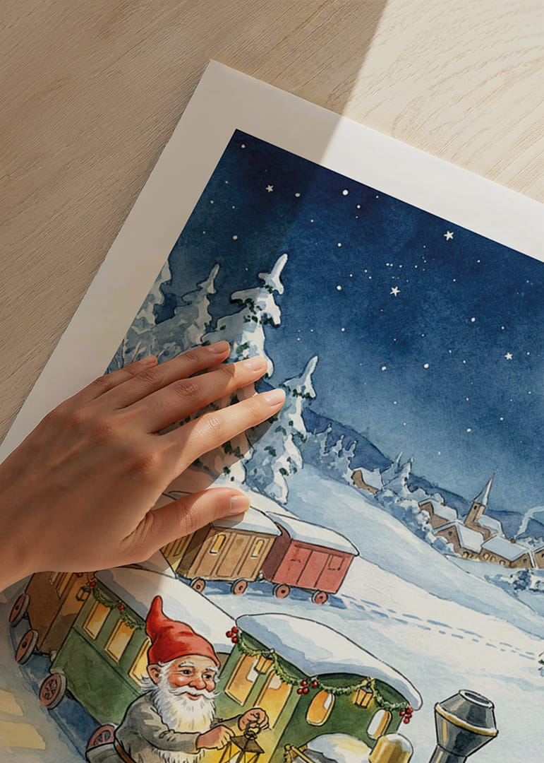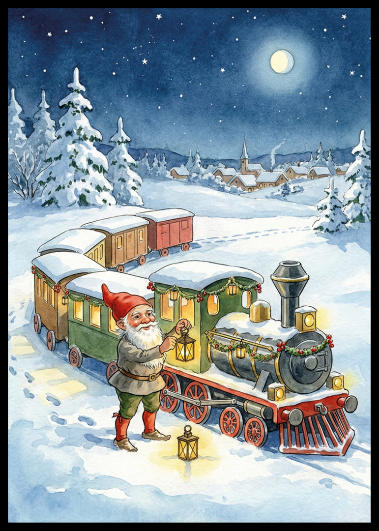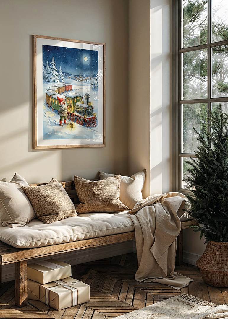 This poster captures an enchanting winter evening where a smiling Santa leads a colorful train through a sparkling snowy landscape. The moonlight illuminates the sky and the picturesque village in the background, creating an atmosphere of magic and adventure. With this motif, you can transform your home into a place where fantasy and reality meet, and where every glance at the poster inspires new dreams